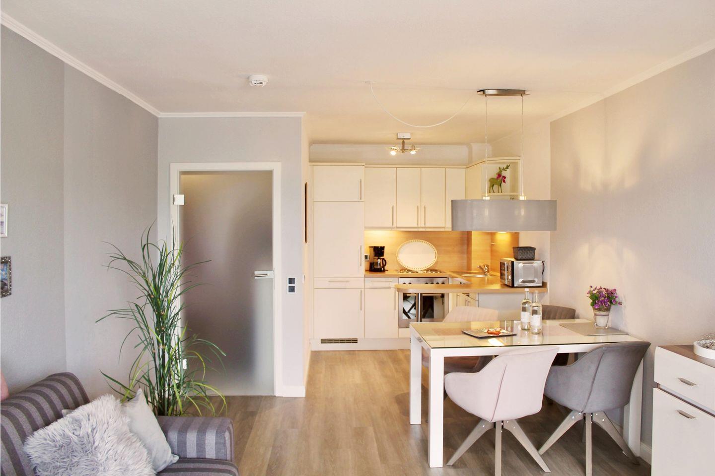 Das Appartement befindet sich im 1. Obergeschoss und ist in Richtung Westen ausgerichtet, wodurch es die letzten Sonnenstrahlen des Tages einfängt. Die Wohnung wurde gerade erst liebevoll renoviert und zum Teil neu eingerichtet. Der Wohnbereich verfügt über ein gemütliches Schlafsofa, welches den Gast zum Erholen und Entspannen einlädt. Die integrierte, voll ausgestattete Küche lässt keine kulinarischen Wünsche offen, von der Mikrowelle bis zum Eierkocher werden Sie hier alle wichtigen Utensilien für ein gelungenes Mahl finden.