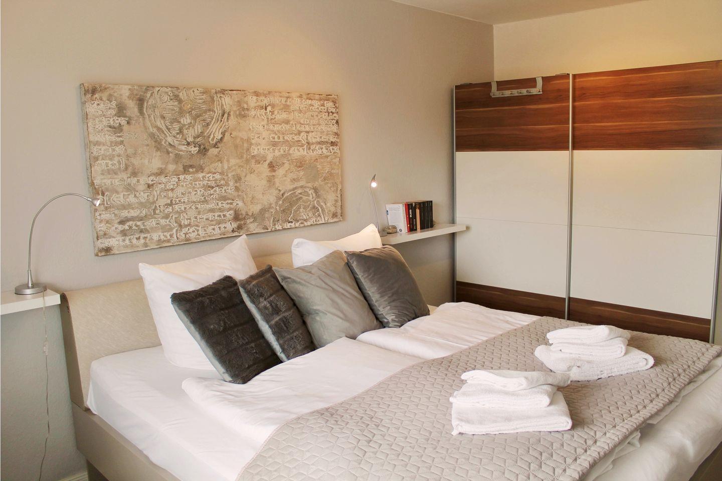 Das hell gestaltete Schlafzimmer, welches mit einem bequemen Doppelbett und einem großen Kleiderschrank ausgestattet ist, lädt Sie ein auch hier ein paar behagliche Stunden des Tages zu verbringen.