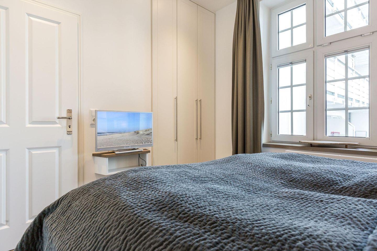 Das Schlafzimmer ist geschmackvoll gestaltet und verfügt über ein komfortables Doppelbett (2x 90x200 cm), einen geräumigen Einbauschrank sowie einen TV – hier können Sie wunderbar entspannen und zur Ruhe kommen.