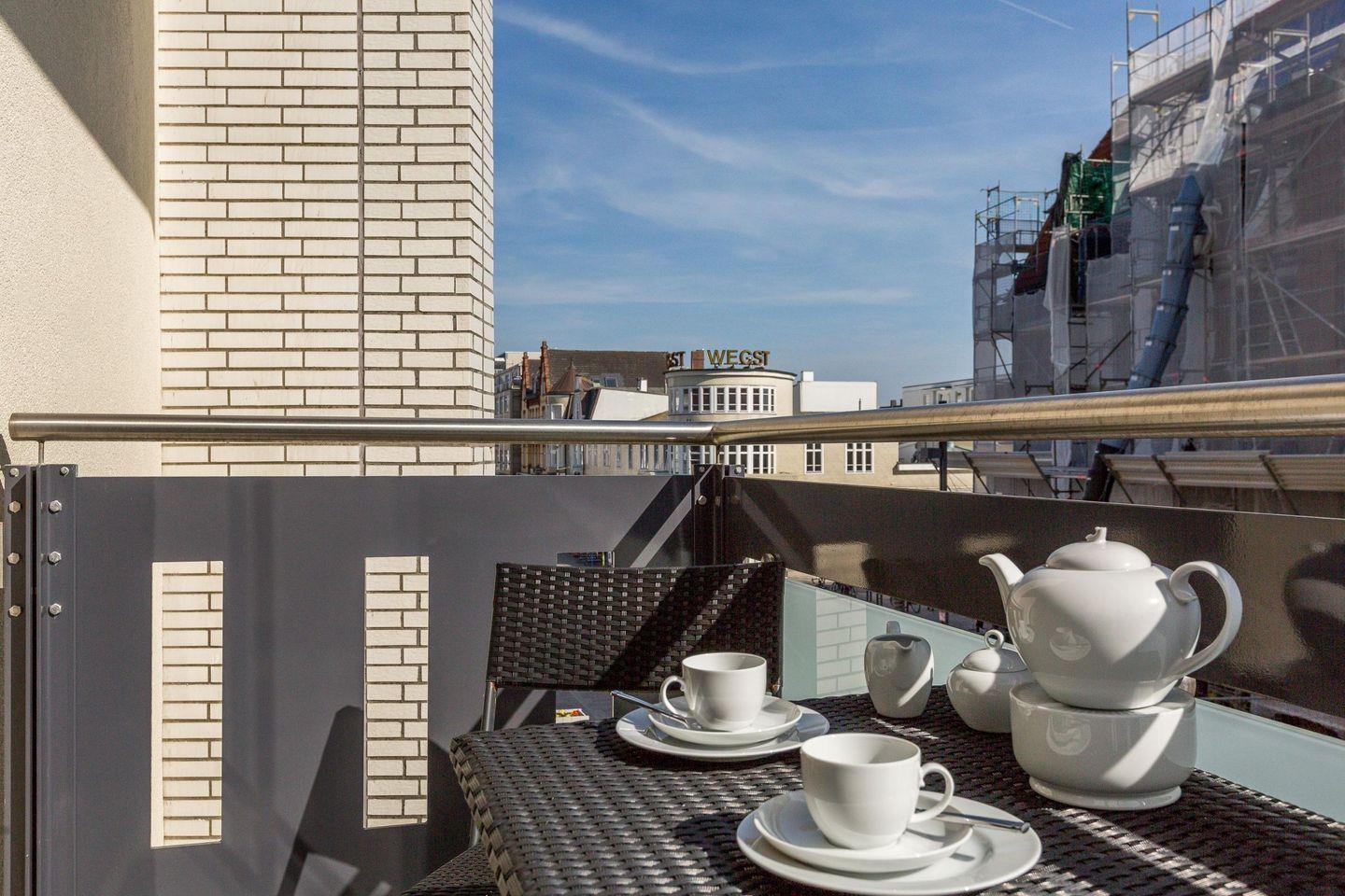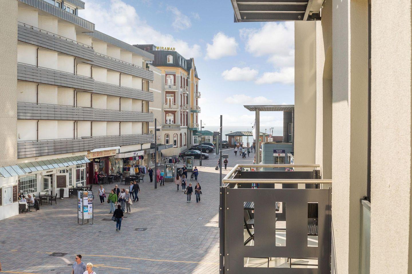 Der offene Wohn- und Essbereich ist stilvoll und komfortabel eingerichtet und mit einem einladenden Ecksofa, einem Sessel und einem TV ausgestattet. Vom Wohnzimmer aus haben Sie direkten Zugang zum sonnigen Süd-Balkon, der Ihnen einen kleinen Blick auf das Meer bietet und zu entspannten Stunden an der frischen Nordseeluft einlädt.