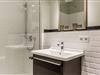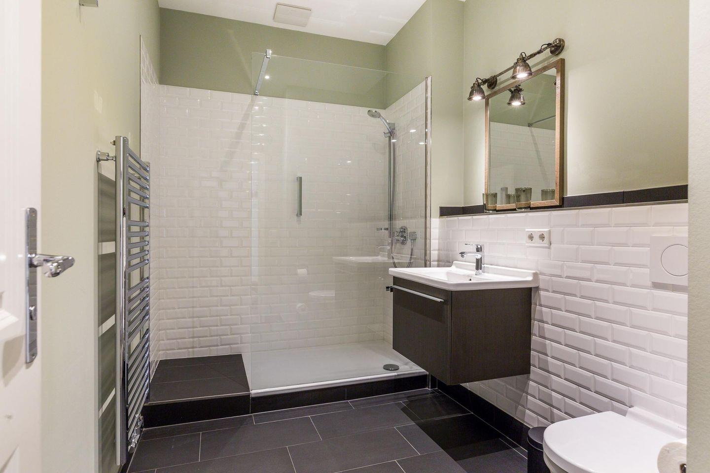 Das moderne Badezimmer ist mit einer Dusche, WC, Fön und Handtuchwärmer ausgestattet und sorgt für einen angenehmen Start in den Tag.