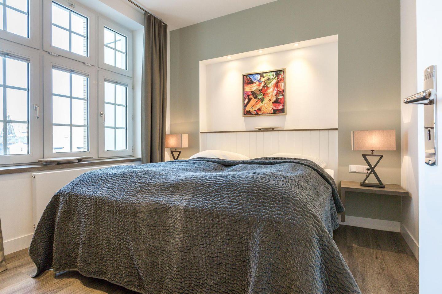 Die exklusive 2-Zimmer-Ferienwohnung 'Luigi' mit ca. 53 m² auf 1 Ebene (1. OG, Fahrstuhl vorhanden) bietet Platz für bis zu 2 Personen und besticht durch ihre zentrale Lage nur 150 Meter vom Strand entfernt. Sie befindet sich im modernen Umbau des traditionsreichen Hotels 'Seeburg' an der Kurpromenade von Westerland, das in Zusammenarbeit mit der renommierten Kunstgalerie Mensing neu gestaltet wurde. Jede der elf Wohnungen ist einem Künstler gewidmet und zeichnet sich durch individuelles Design im charmanten Retro-Look aus, ausgestattet mit hochwertigem Mobiliar aus Frankreich, Belgien und England. Hunde sind herzlich willkommen.