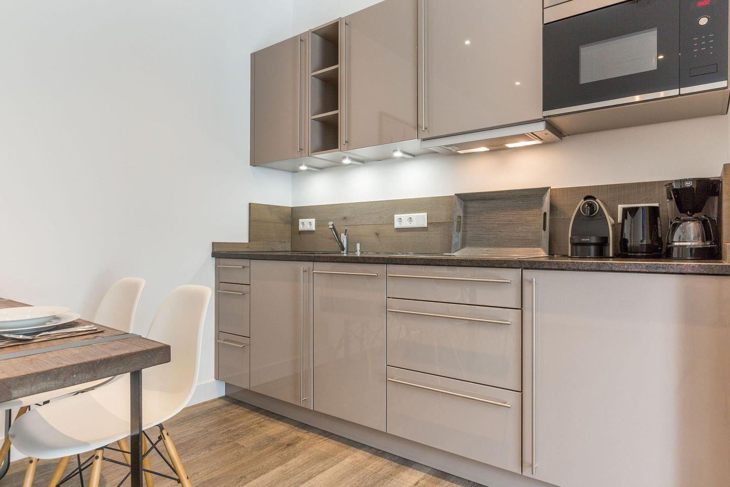Die offene Küche fügt sich harmonisch in den Wohnbereich ein und ist mit modernem Komfort ausgestattet, ideal für die Zubereitung von Mahlzeiten. Der angrenzende Esstisch bietet Platz für vier Personen und lädt zu gemütlichen Mahlzeiten und entspannten Abenden ein.