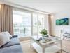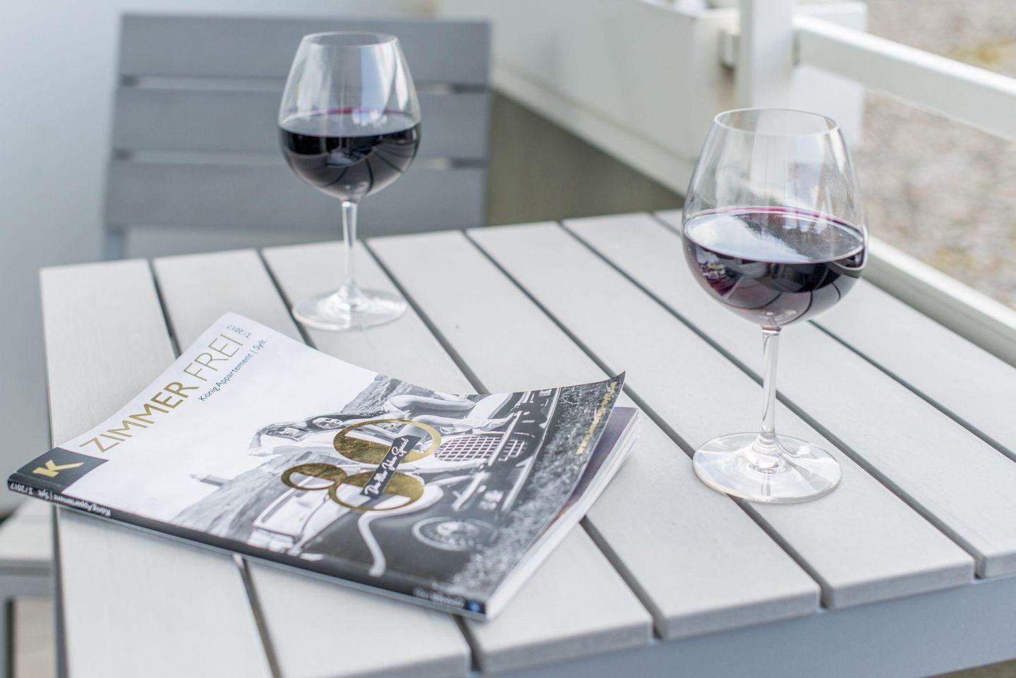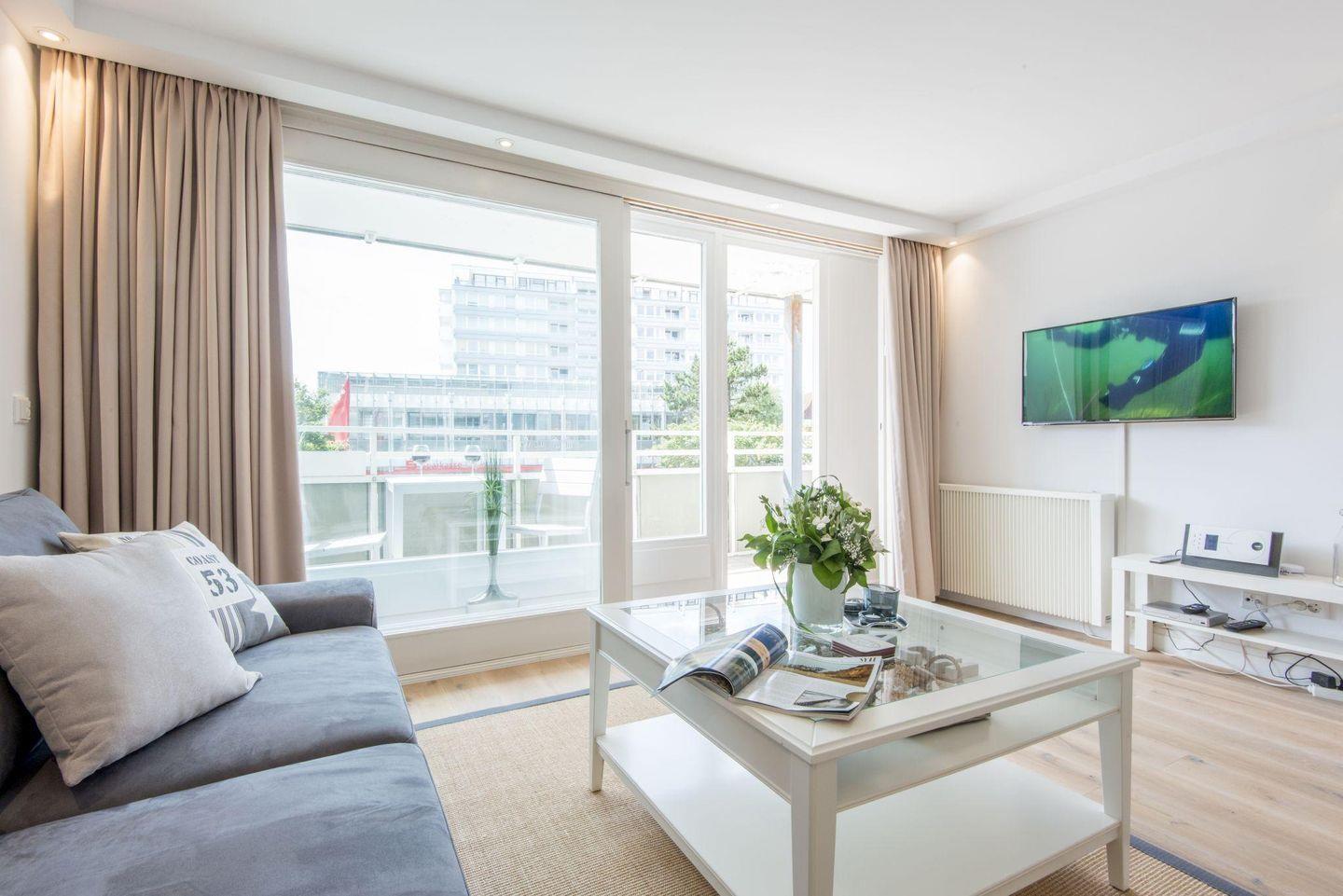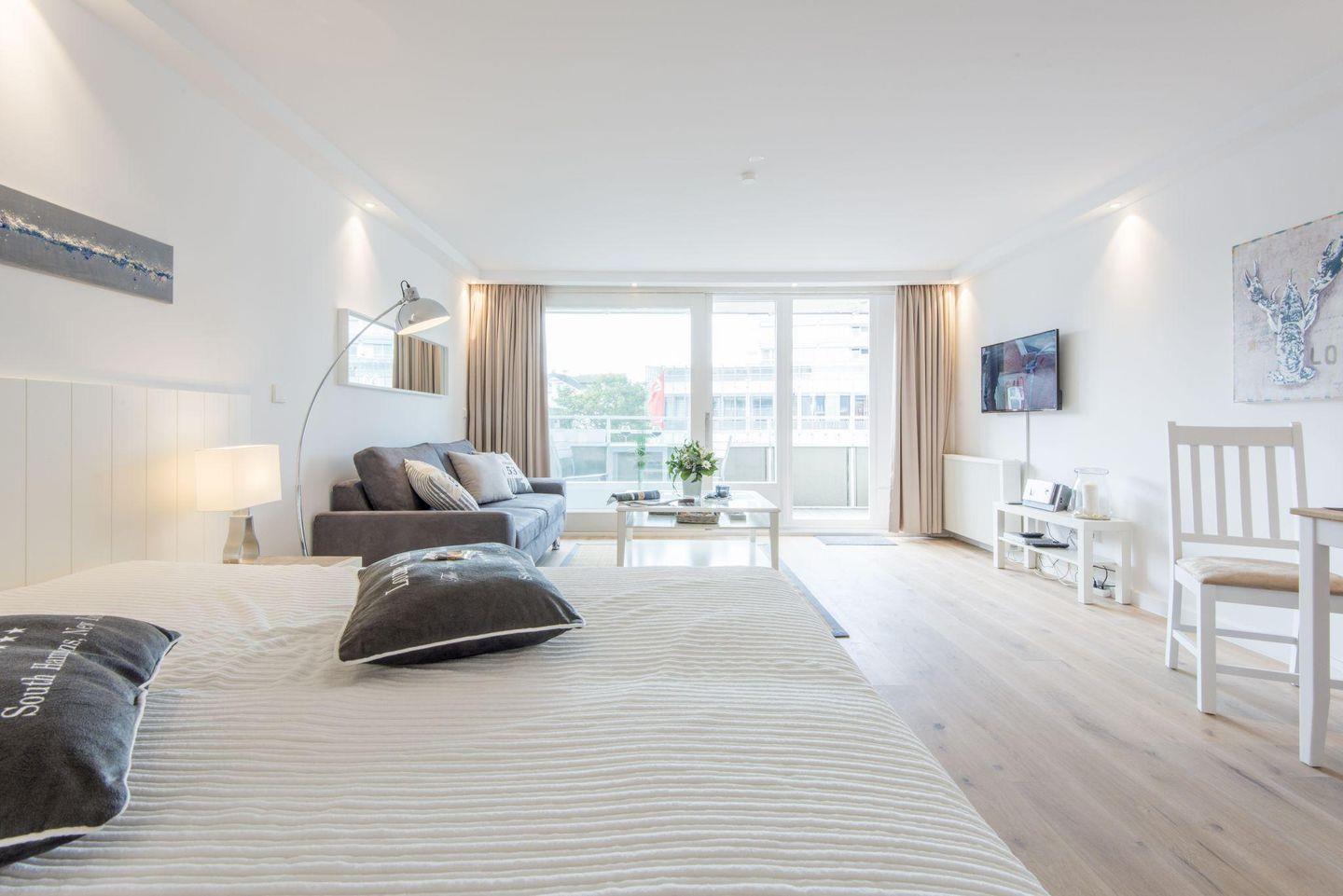Der großzügige Wohn- und Schlafbereich ist mit einem komfortablen Doppelbett (2 x 90x200 cm), einem Sofa und einem TV ausgestattet. Ein Essbereich mit Tisch und zwei Stühlen ergänzt den Raum. Vom Wohnbereich aus gelangen Sie direkt auf den West-Balkon, auf dem Sie den Abend entspannt ausklingen lassen können.