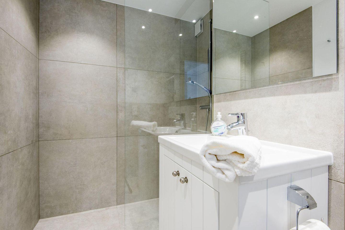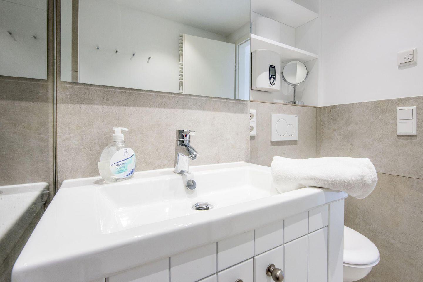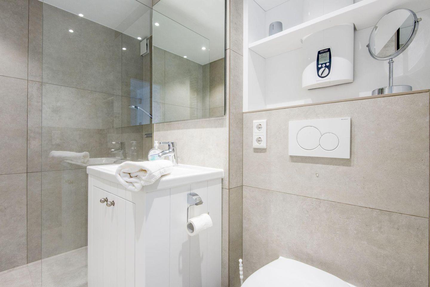 Das moderne Badezimmer ist mit einer Dusche, WC, einem Handtuchwärmer und einem Föhn ausgestattet – alles, was Sie für einen angenehmen Aufenthalt benötigen.