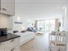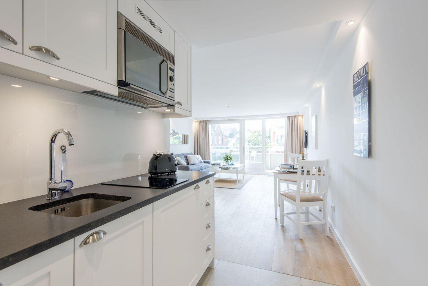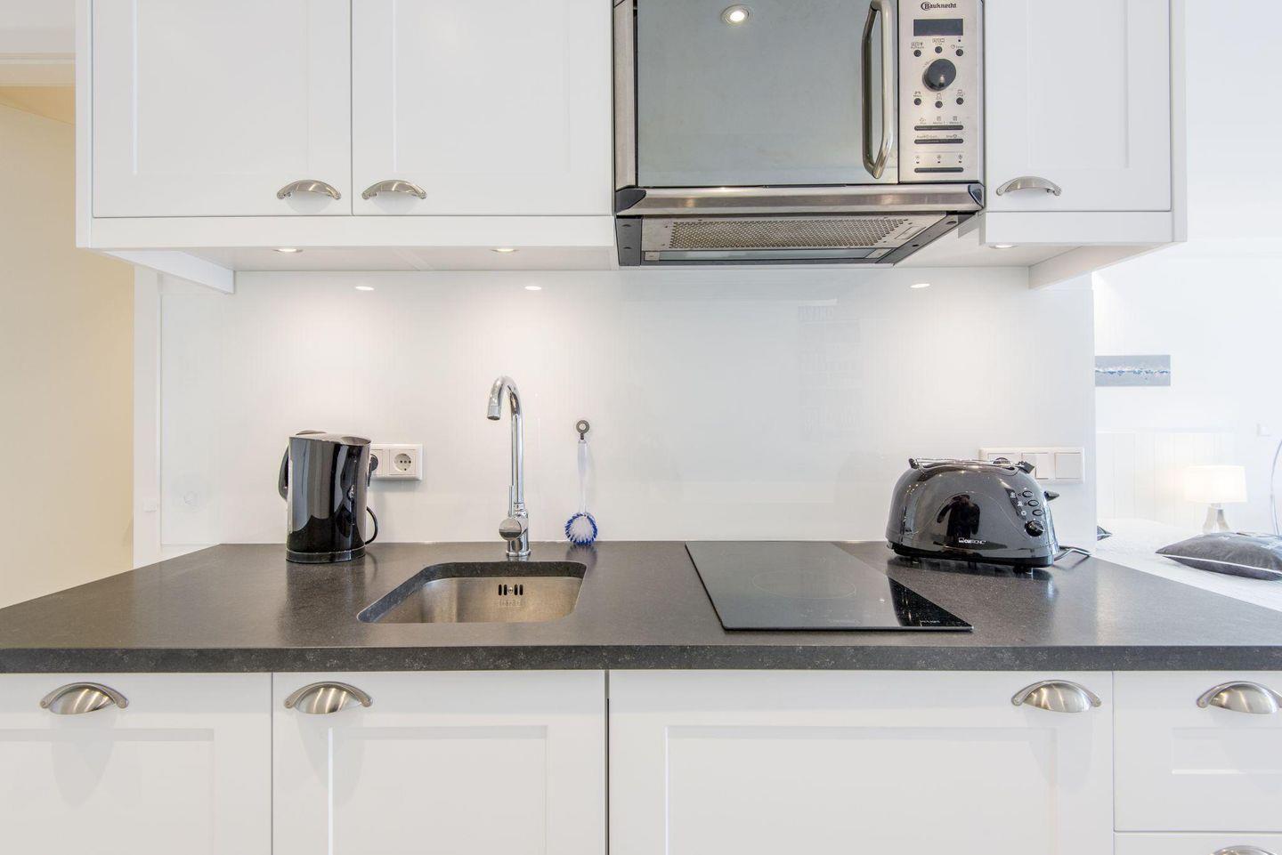 Die moderne, offene Küche ist praktisch und komfortabel eingerichtet. Sie verfügt über ein 2er Cerankochfeld, eine Mikrowelle, einen Geschirrspüler und weiteren Komfort, um kleinere Mahlzeiten unkompliziert zuzubereiten.