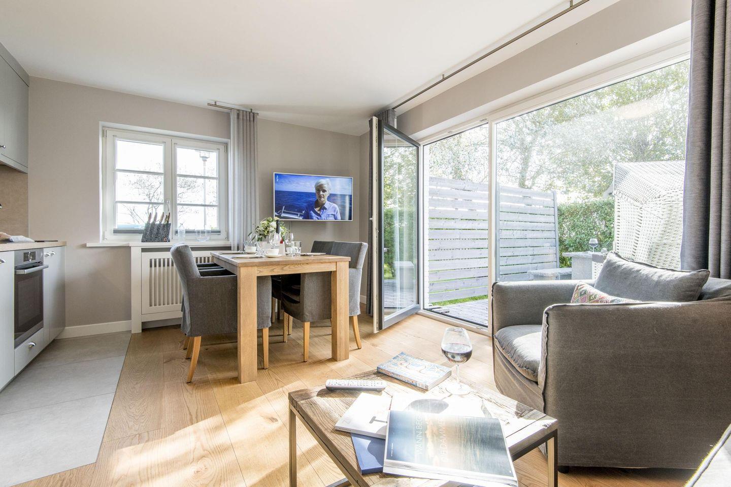 Der lichtdurchflutete Wohnbereich ist geschmackvoll eingerichtet und bietet eine gemütliche Schlafcouch, auf der ein weiterer Gast Platz findet. Bodentiefe Fenster lassen viel Tageslicht herein und öffnen sich zur sonnigen Südterrasse. Die Terrasse mit Strandkorb lädt zum Verweilen ein, sodass Sie hier die frische Nordseeluft genießen und den Tag in Ruhe ausklingen lassen können.