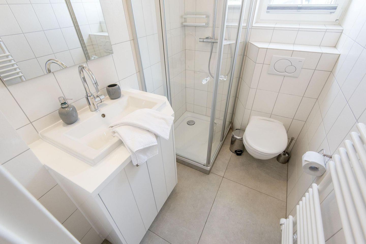 Das moderne Duschbad ist mit einer ebenerdigen Dusche, WC, Handtuchwärmer und Fön ausgestattet und bietet alles, was Sie für einen angenehmen Start in den Tag benötigen.
