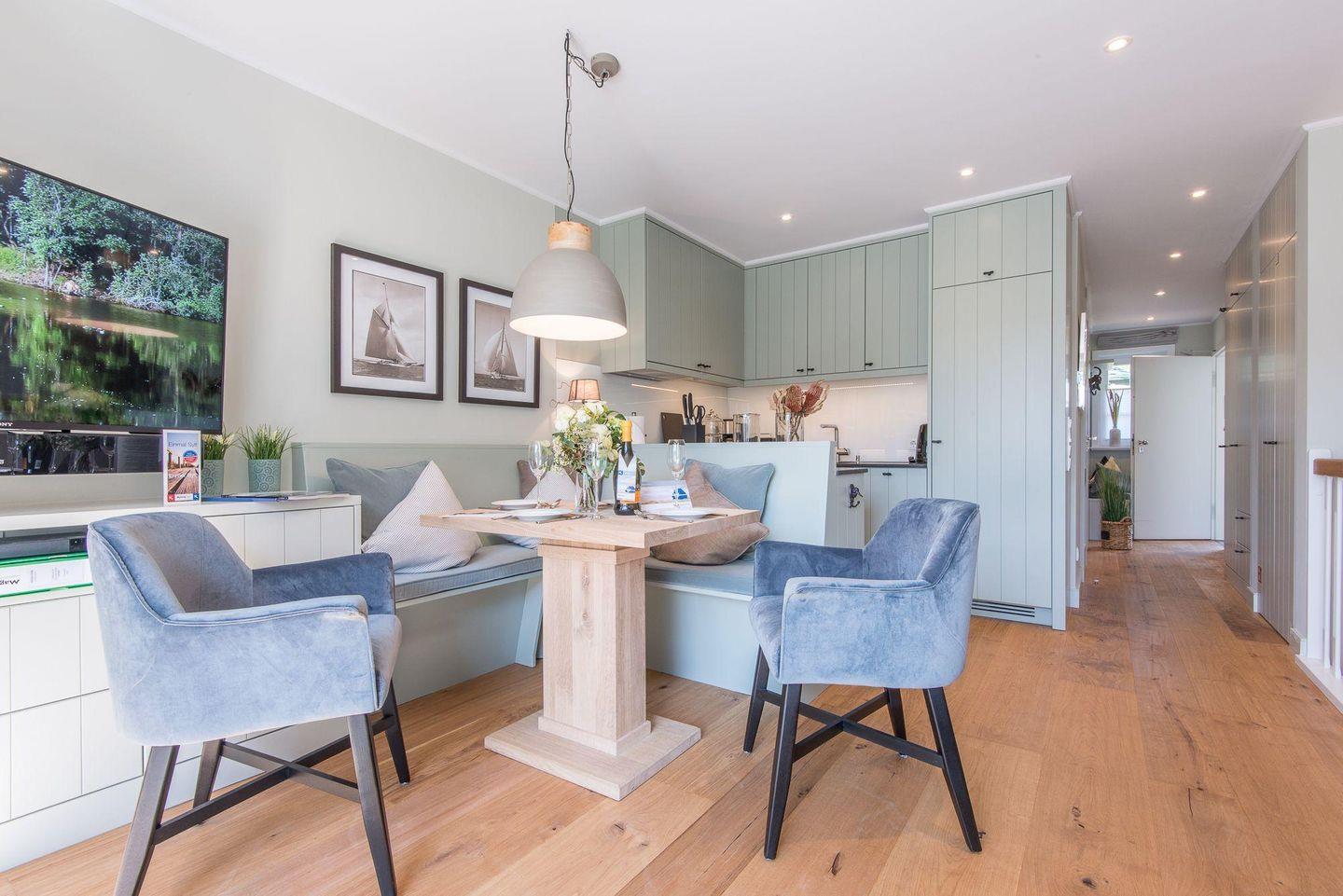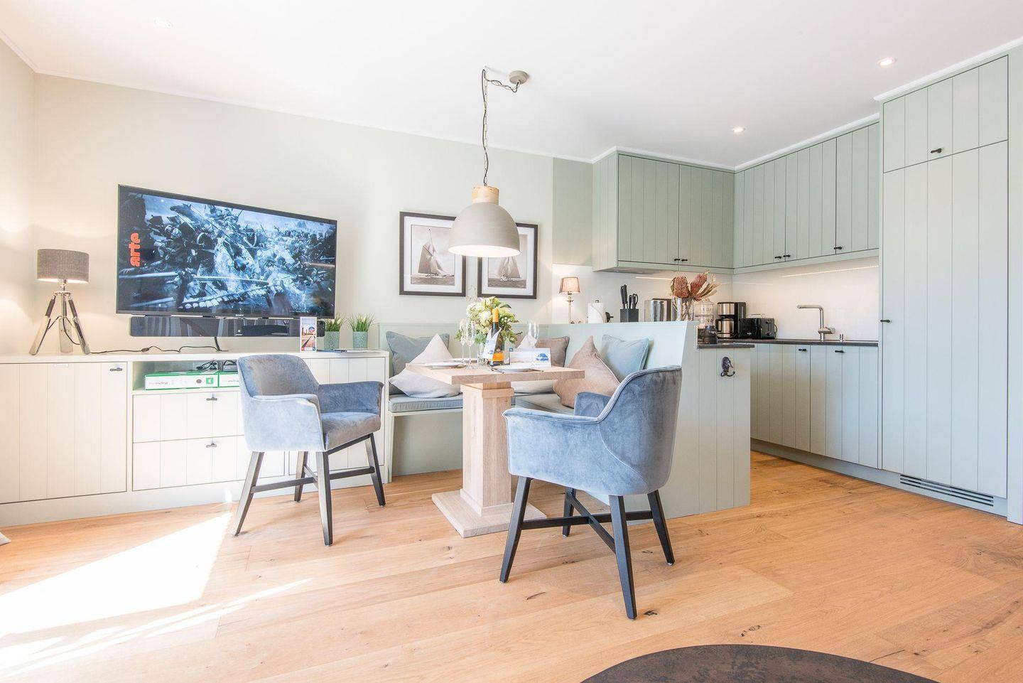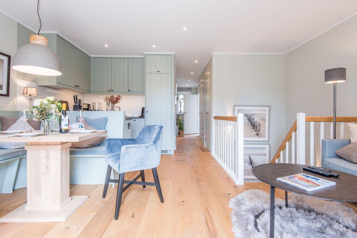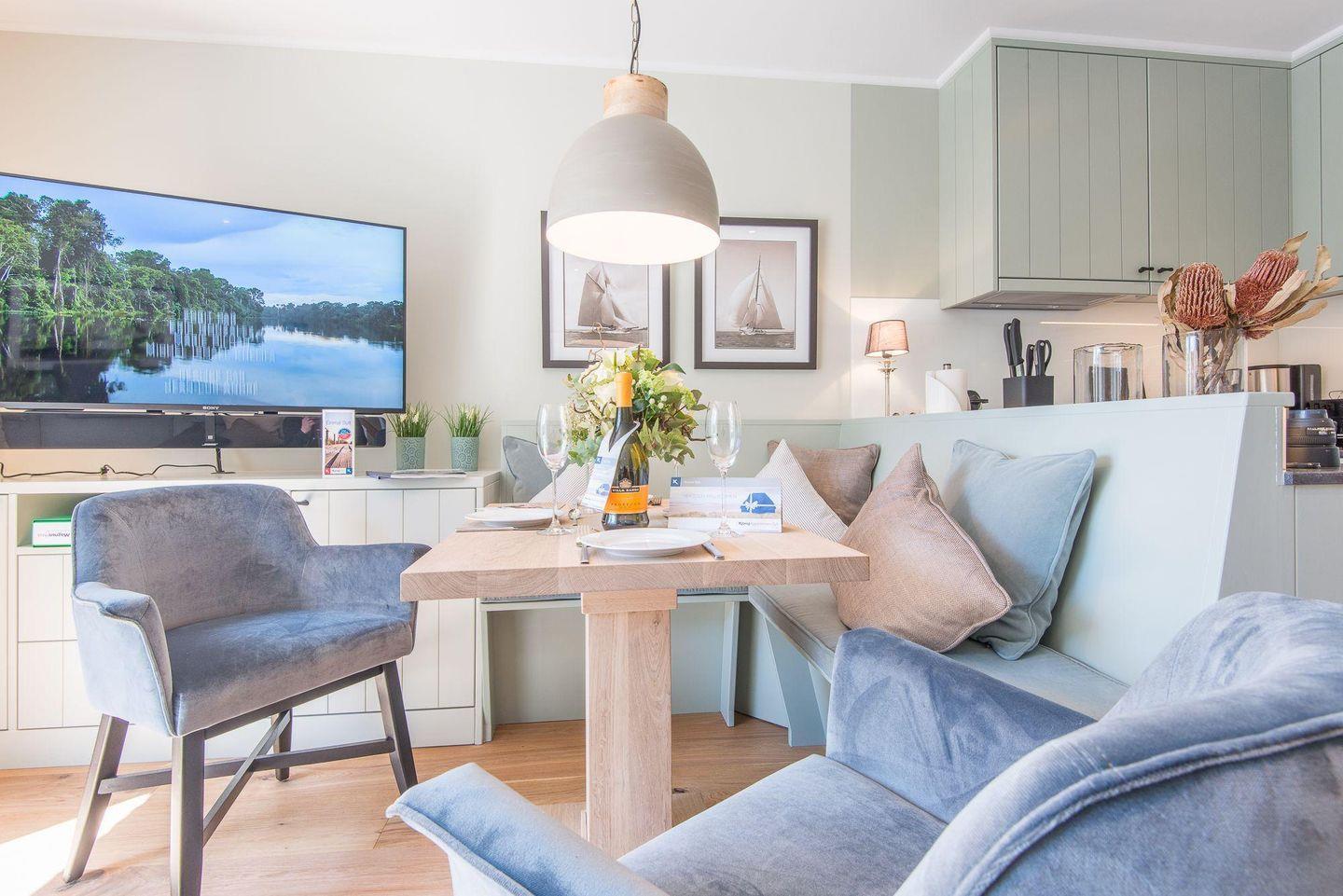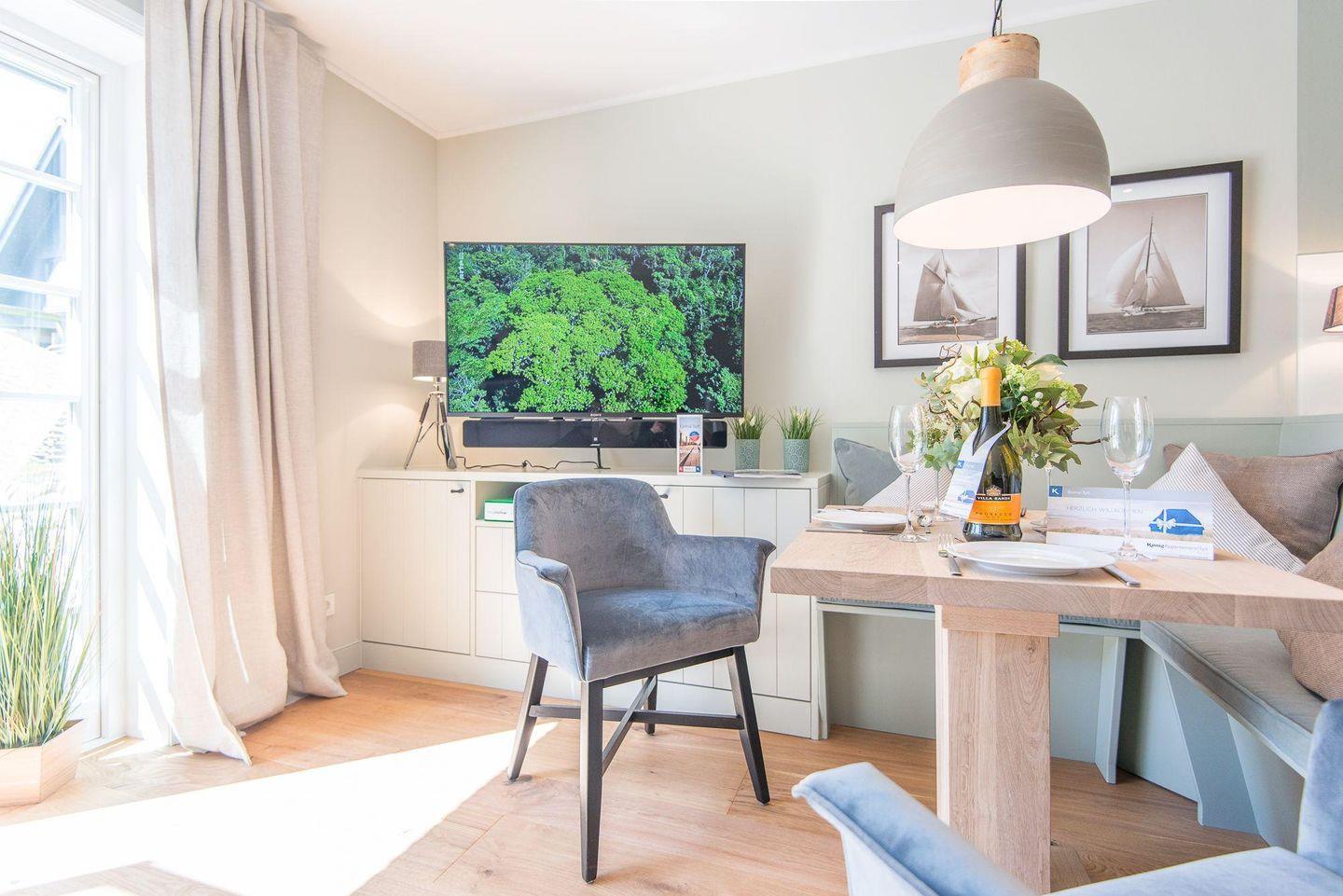Der helle Wohnbereich lädt mit einer großzügigen Eckcouch und einem modernen TV zum Verweilen ein. Der Essbereich mit einer gemütlichen Eck-Sitzbank und zwei Stühlen bietet genügend Platz für gesellige Abende. Der direkte Zugang zur sonnigen Süd-Terrasse mit Strandkorb und hochwertigen Gartenmöbeln schafft einen entspannenden Außenbereich, ideal für ein Frühstück in der Sonne oder gemütliche Stunden am Nachmittag.
