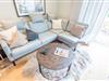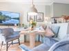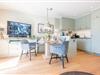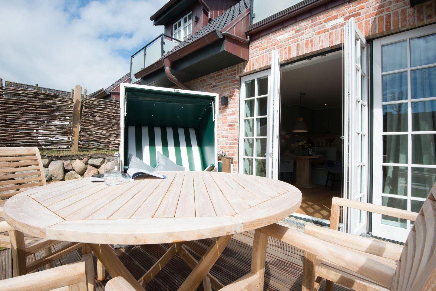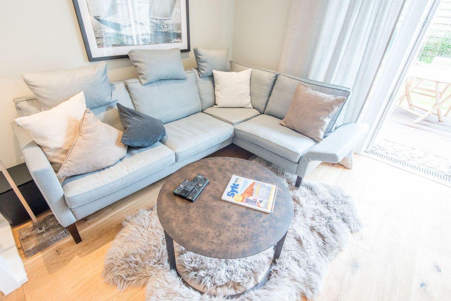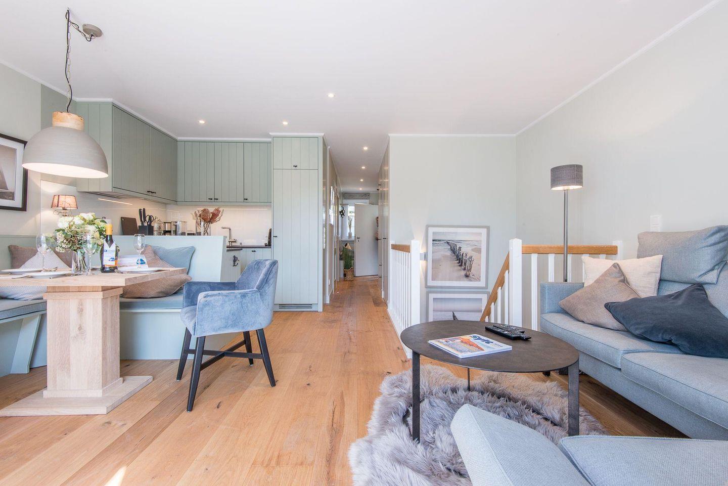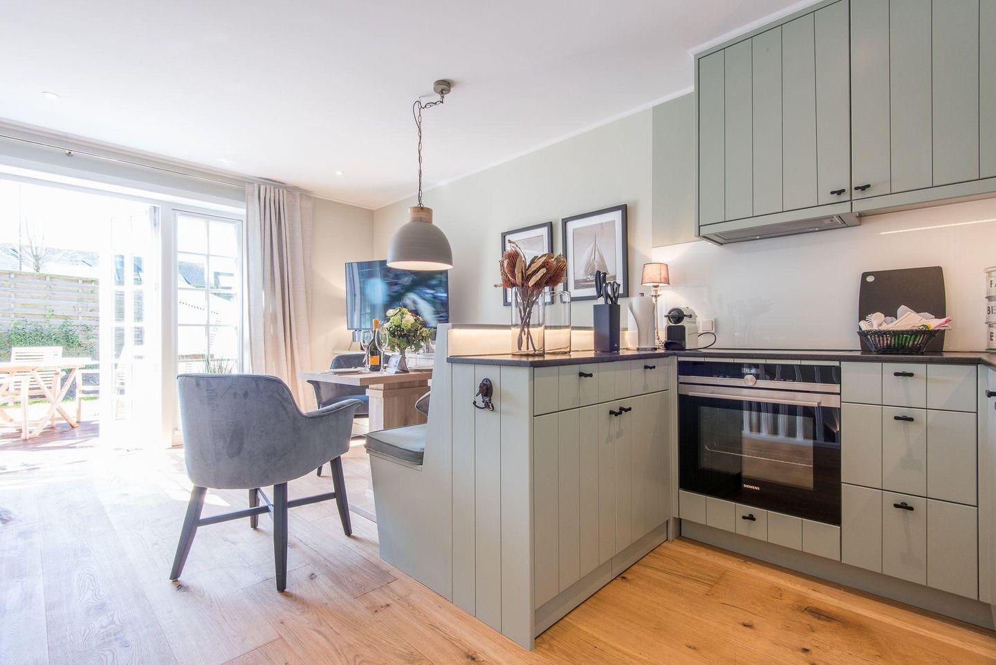 Der helle Wohnbereich lädt mit einer großzügigen Eckcouch und einem modernen TV zum Verweilen ein. Der Essbereich mit einer gemütlichen Eck-Sitzbank und zwei Stühlen bietet genügend Platz für gesellige Abende. Der direkte Zugang zur sonnigen Süd-Terrasse mit Strandkorb und hochwertigen Gartenmöbeln schafft einen entspannenden Außenbereich, ideal für ein Frühstück in der Sonne oder gemütliche Stunden am Nachmittag.