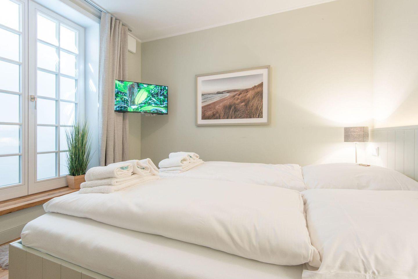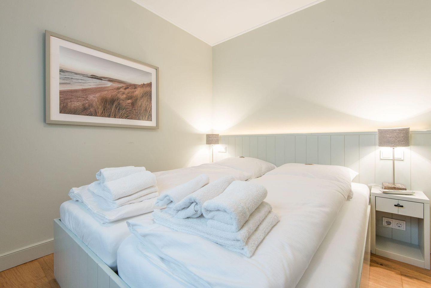 Im ersten Schlafzimmer erwartet Sie ein komfortables Doppelbett (2x 80x200 cm), ein Einbauschrank und ein TV – ideal für erholsame Nächte. Das zweite Schlafzimmer ist ebenfalls mit einem Doppelbett (2x 80x200 cm), Einbauschrank und TV ausgestattet und bietet eine ruhige Rückzugsmöglichkeit.