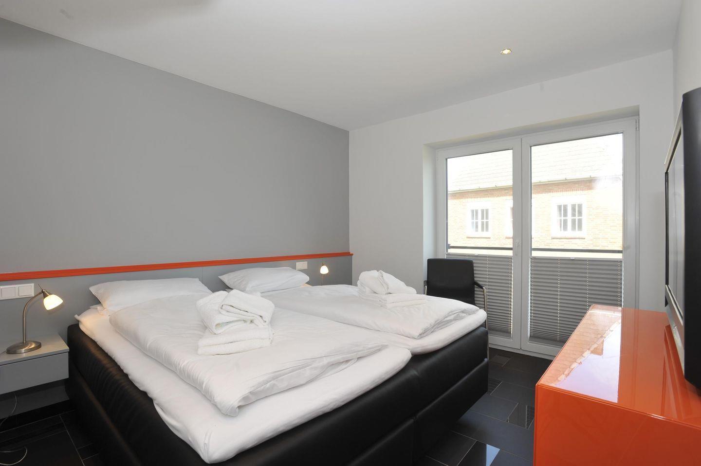 Das erste Schlafzimmer ist mit einem Doppelbett (2x 90x200 cm), einem geräumigen Einbauschrank, einer Kommode, einem Sessel und einem TV ausgestattet – perfekt für erholsame Nächte. Das zweite Schlafzimmer verfügt ebenfalls über ein Doppelbett (2x 90x200 cm), einen Einbauschrank, eine Kommode, einen Stuhl und einen TV.