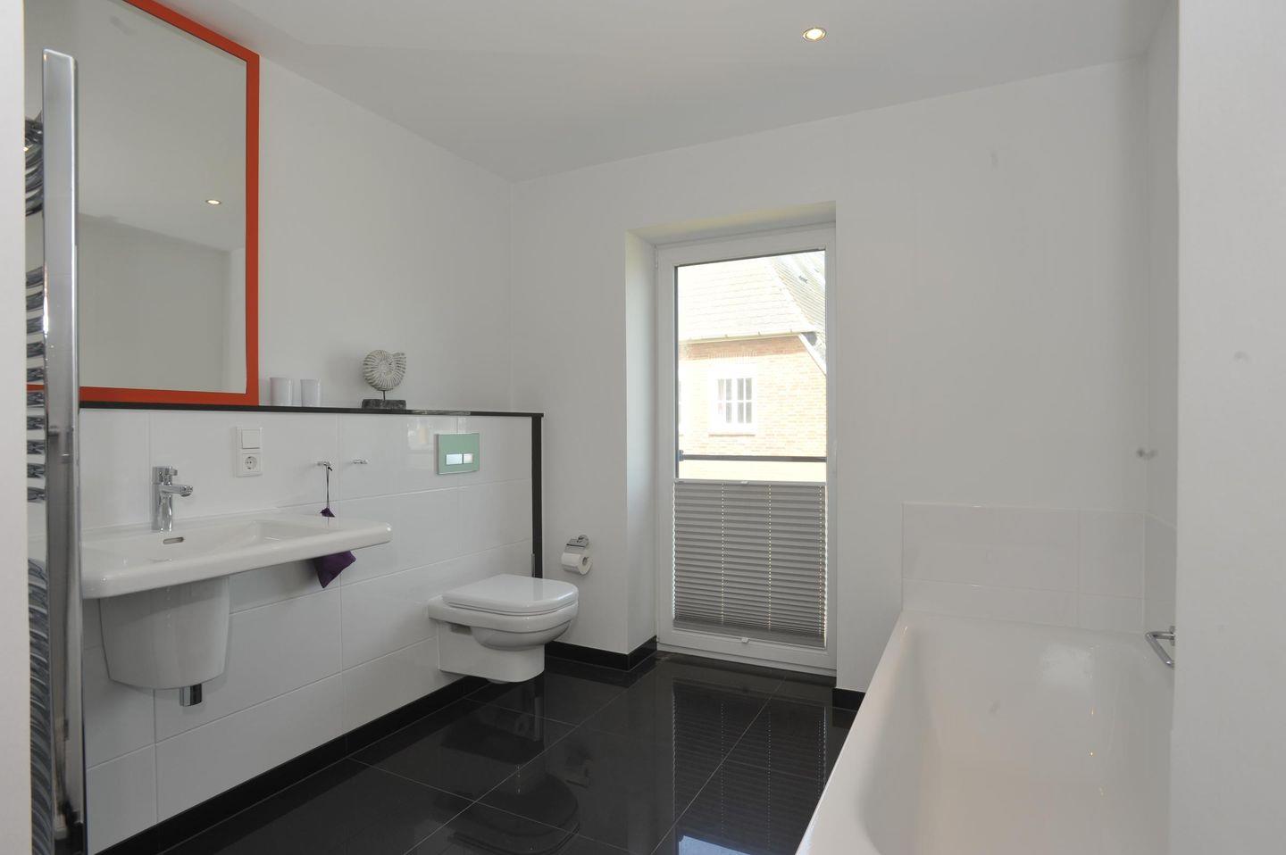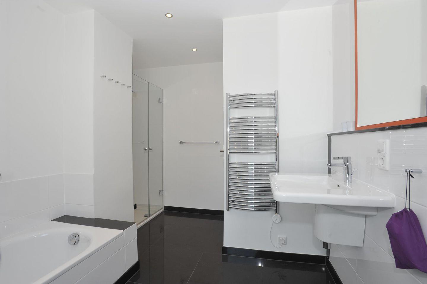 Das stilvolle Badezimmer bietet höchsten Komfort mit einer Badewanne, einer separaten Dusche, WC, Handtuchwärmer, Föhn und Tageslicht – ideal für entspannende Wellnessmomente nach einem Strandtag.