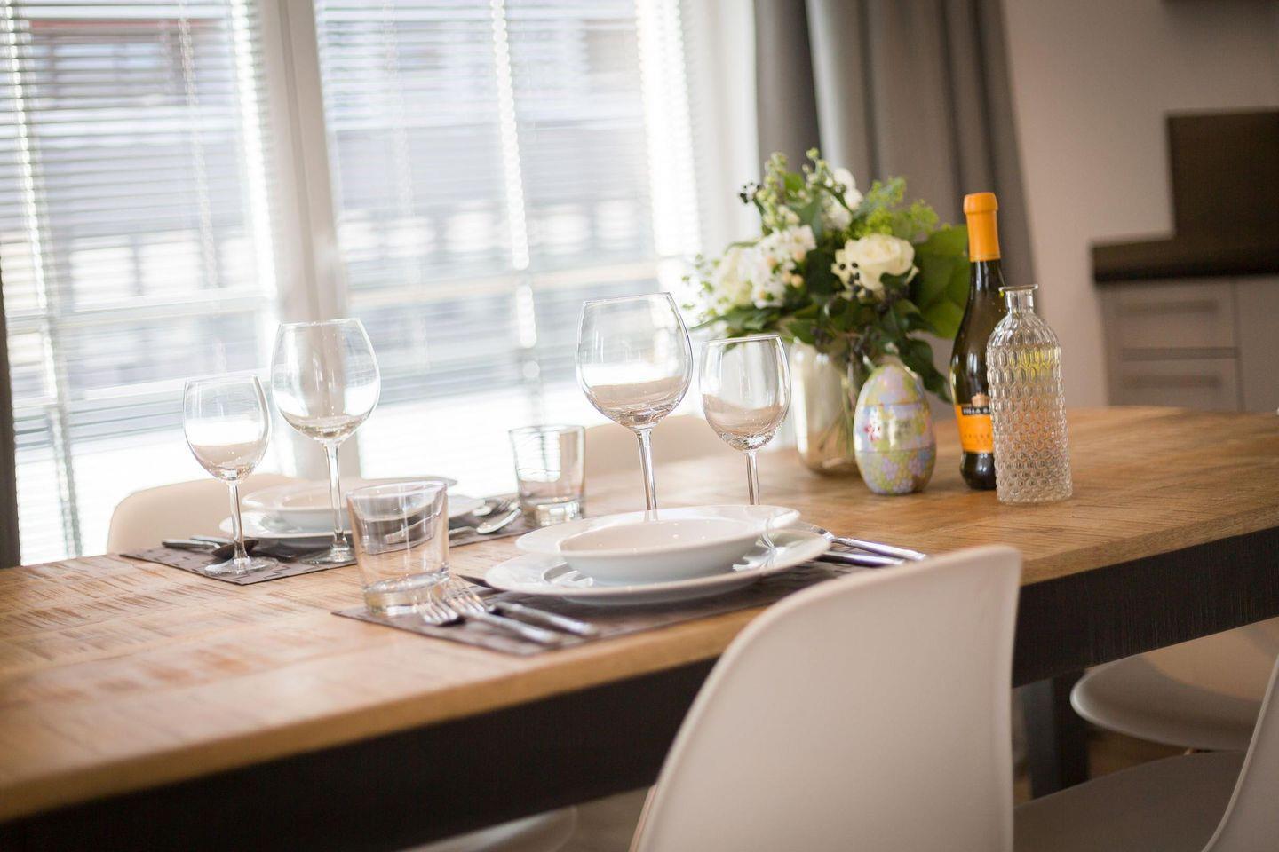 Die offene Küche ist modern und voll ausgestattet, sodass es Ihnen an nichts fehlt. Hier können Sie Ihre Lieblingsgerichte zubereiten und am großzügigen Esstisch mit sechs Stühlen genießen, ideal für ein Abendessen oder ein gemütliches Frühstück.