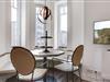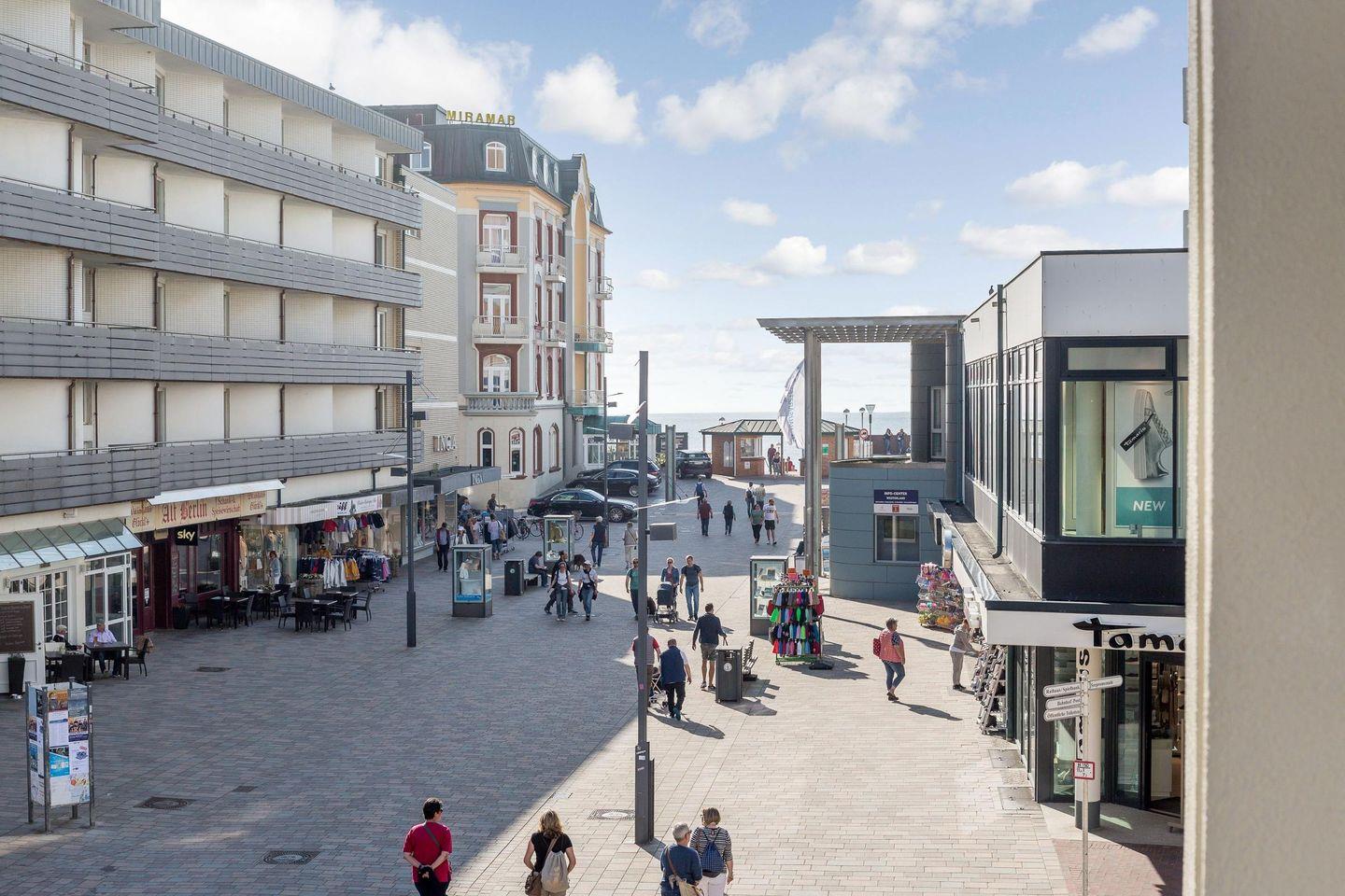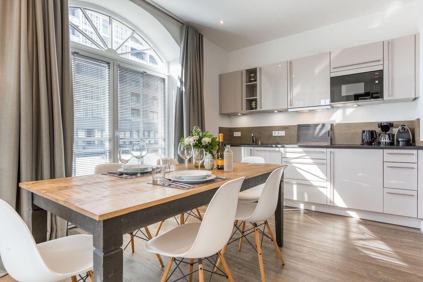 Im großzügigen Wohnzimmer erwartet Sie eine gemütliche Sitzecke mit Ecksofa und Sesseln, die ideal für entspannte Abende ist. Der Ausblick auf die lebhafte Friedrichstraße und das Meer ist ein Highlight dieser Wohnung. Die Essecke mit einer charmanten Sitzbank befindet sich im runden Turm des Hauses und bietet durch die Rundum-Verglasung einen einmaligen Panoramablick. Von hier aus gelangen Sie direkt auf den sonnigen Süd-Balkon, wo Sie die frische Meeresbrise genießen können.