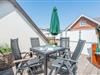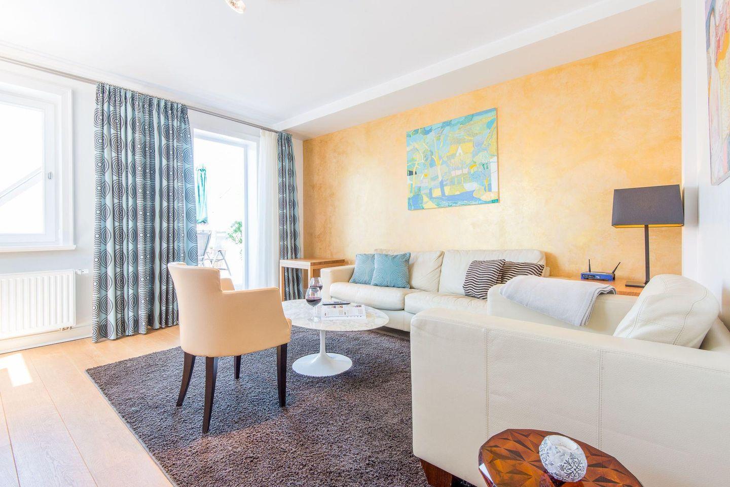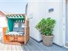 Das gemütliche Wohnzimmer ist mit einem Sofa, einem Sessel, einer Vitrine und einem modernen TV ausgestattet. Der direkte Zugang zur großen Dachterrasse, die mit einem Strandkorb und Gartenmöbeln ausgestattet ist, bietet viel Raum für sonnige Stunden und Entspannung an der frischen Nordseeluft.