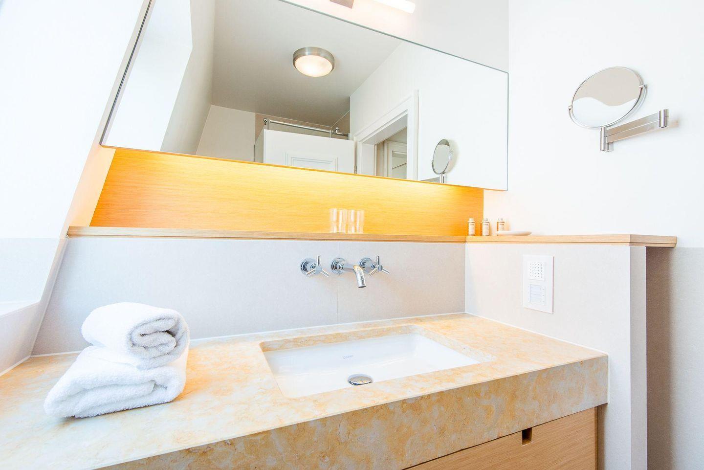 Das erste Badezimmer ist großzügig gestaltet und verfügt über eine Badewanne, eine Dusche, ein WC und einen Handtuchwärmer. Der Natursteinfußboden verleiht dem Raum eine luxuriöse Note. Das zweite Badezimmer ist mit einer Dusche, einem WC, einem Handtuchwärmer und Tageslicht ausgestattet – ebenfalls mit elegantem Natursteinfußboden.