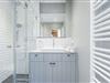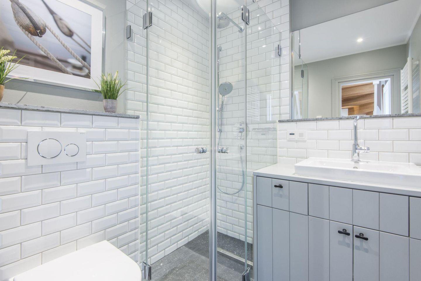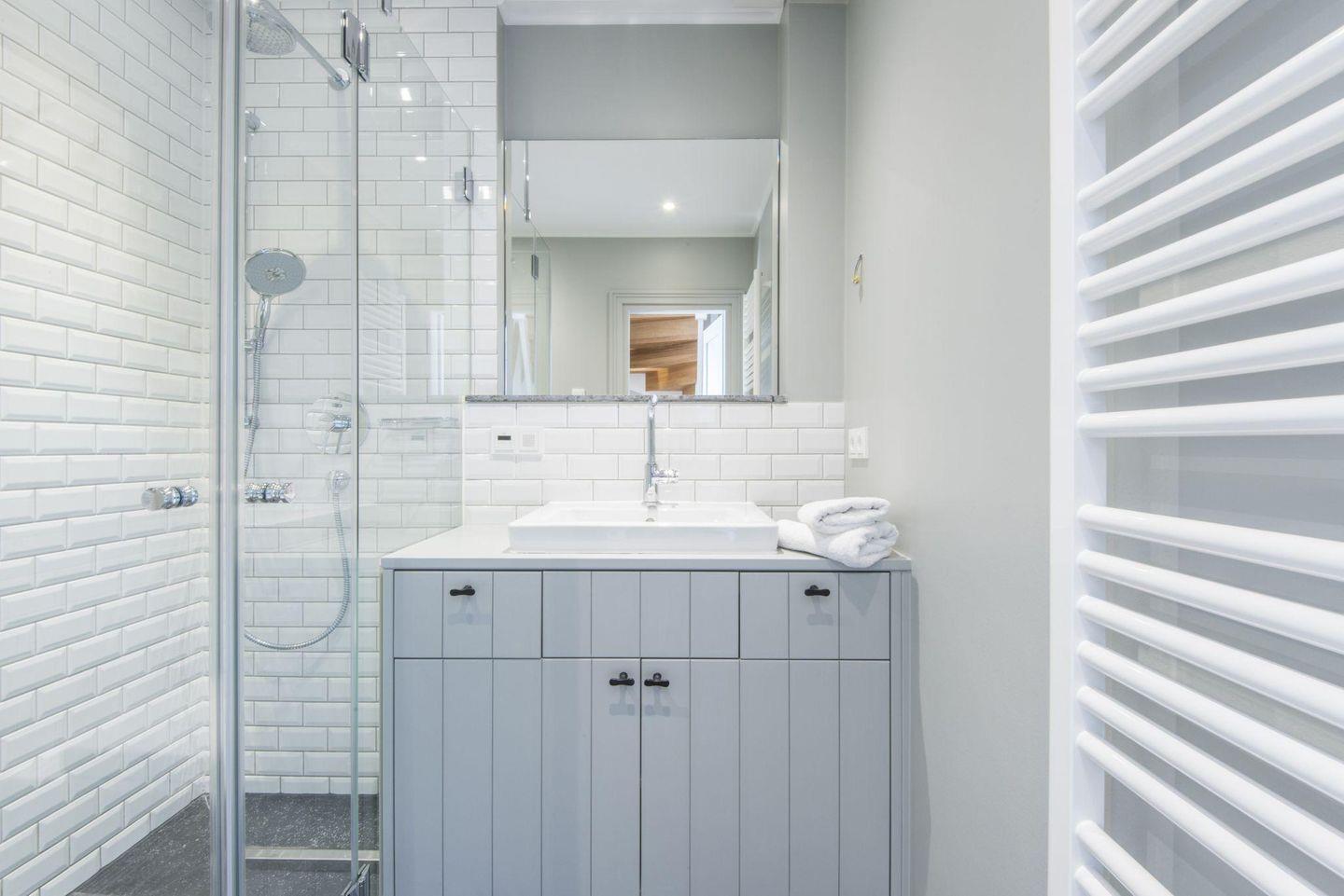 Das stilvolle Badezimmer bietet eine ebenerdige Dusche, WC, Handtuchwärmer und Föhn und sorgt für den perfekten Start in den Tag oder eine entspannende Auszeit am Abend. Zusätzlich lädt der gemeinschaftliche Wellnessbereich des Hauses mit Sauna, Dampfbad und Schwalldusche zum Abschalten ein.