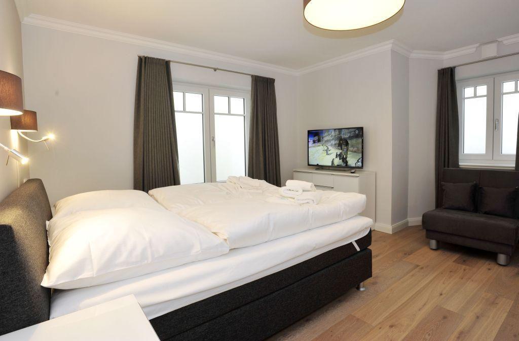 Das Hauptschlafzimmer ist nach Süden ausgerichtet und bietet ein komfortables Doppelbett (180x200 cm), einen Kleiderschrank und einen TV. Das zweite Schlafzimmer liegt nach Osten und verfügt über ein etwas kleineres Doppelbett (160x200 cm), ebenfalls mit Kleiderschrank und TV ausgestattet.
