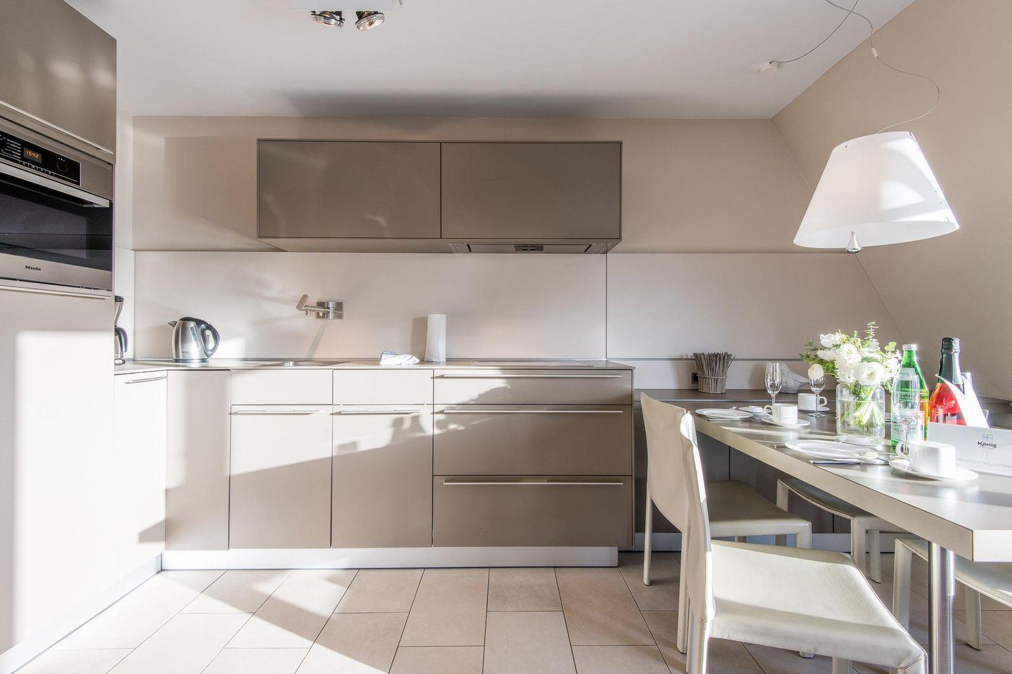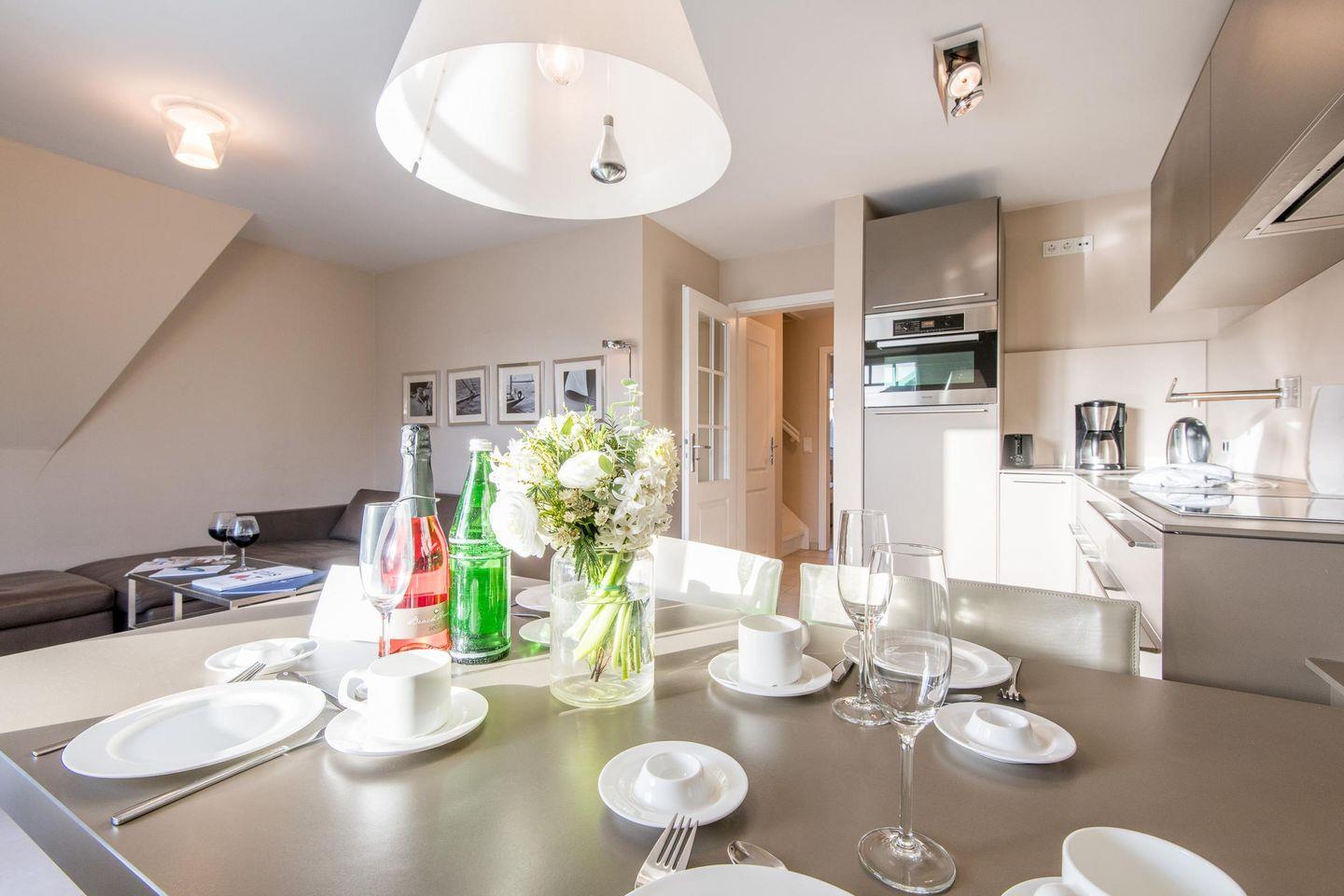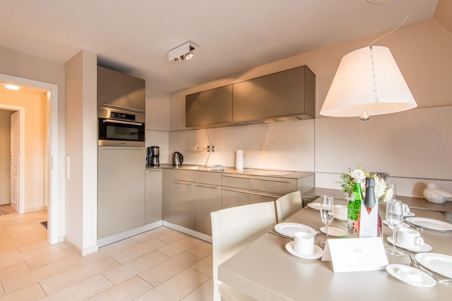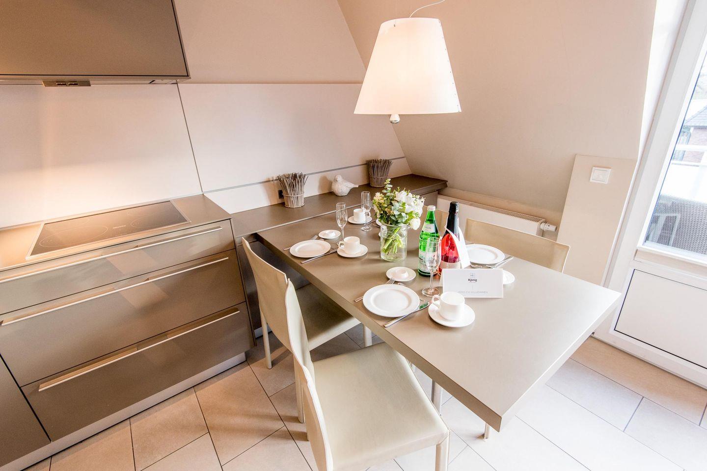 Die moderne, offene Küche ist mit einem Induktionsherd, Filterkaffeemaschine und allen wichtigen Geräten ausgestattet, um Ihnen einen komfortablen Aufenthalt zu ermöglichen.