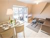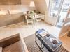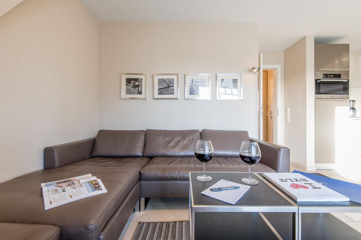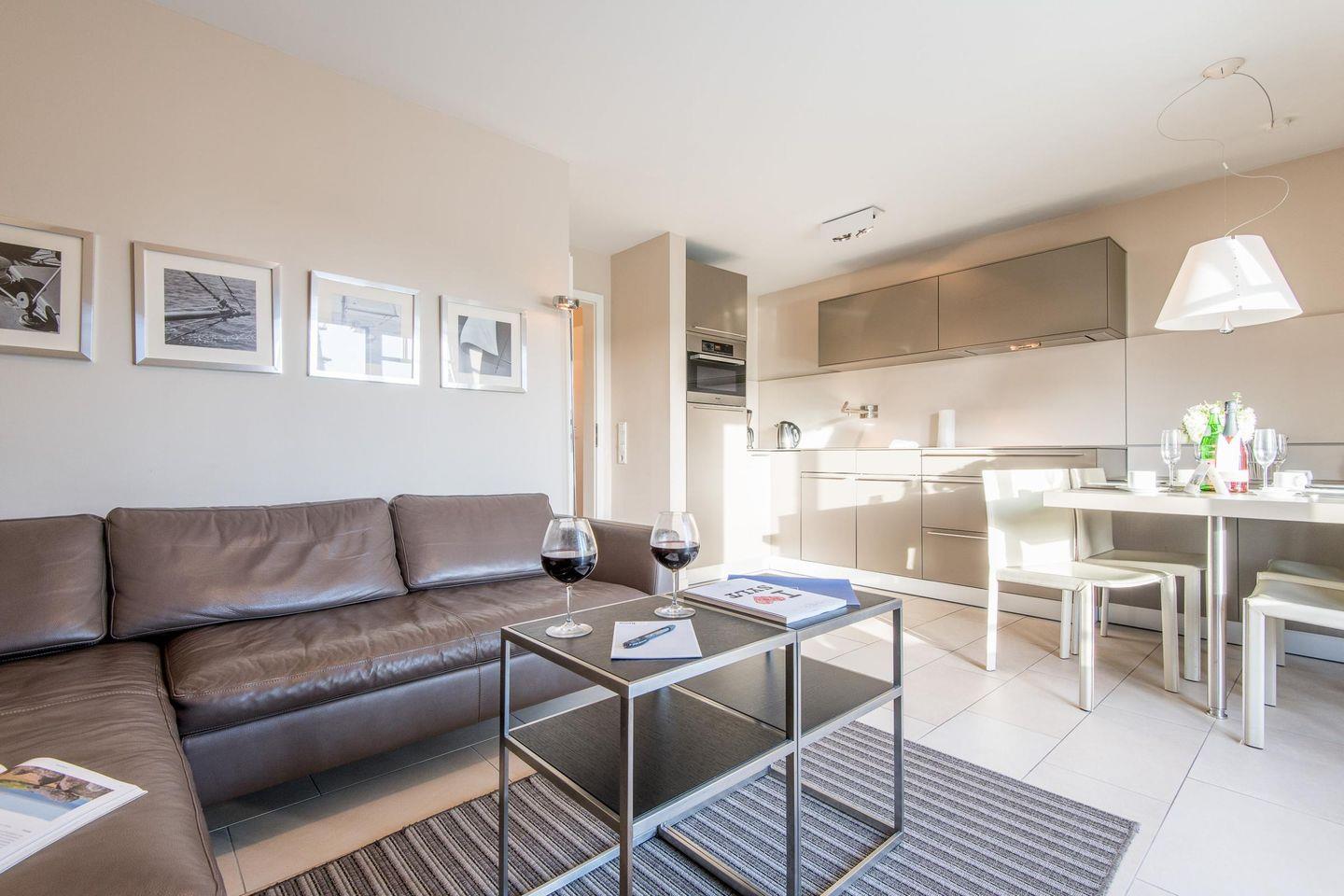 Das großzügige Wohnzimmer verfügt über eine bequeme Eck-Ledercouch, einen TV und einen Esstisch für 4 Personen. Vom Wohnbereich aus haben Sie direkten Zugang zum möblierten Balkon nach Süden, der viel Sonne und Entspannung verspricht.