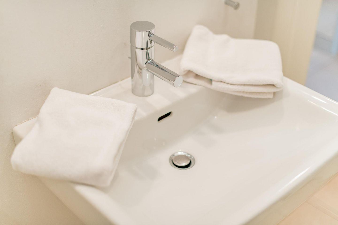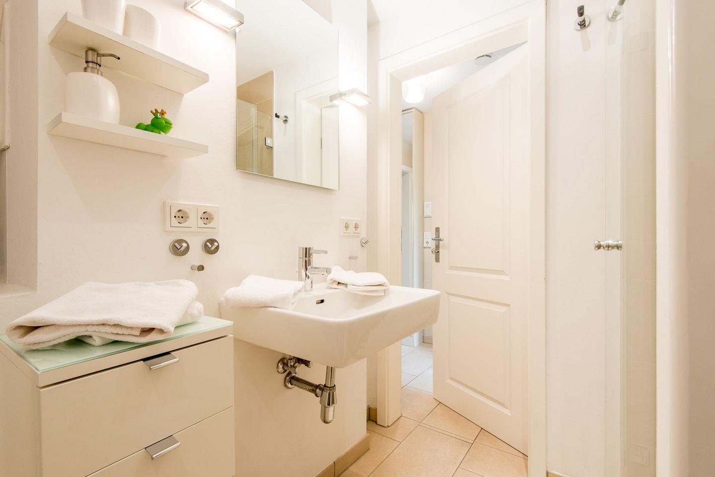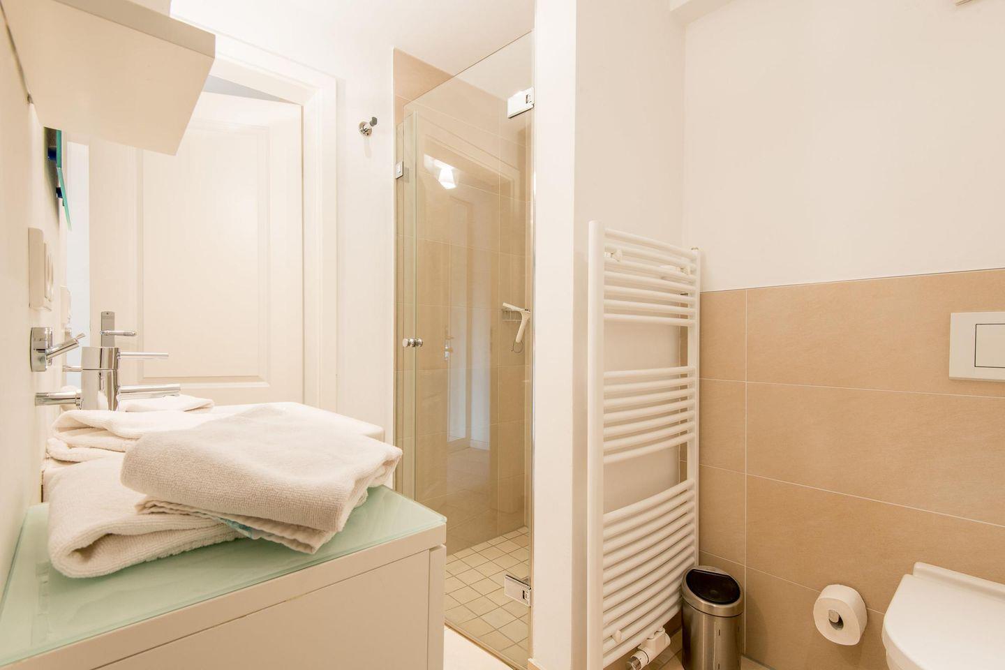 Das moderne Badezimmer ist mit einer ebenerdigen Dusche, WC, Handtuchwärmer, Föhn und einem Waschtrockner ausgestattet und bietet somit hohen Komfort.