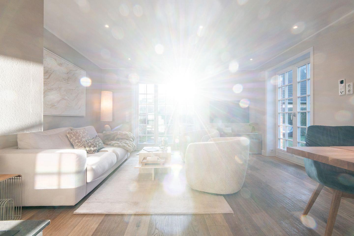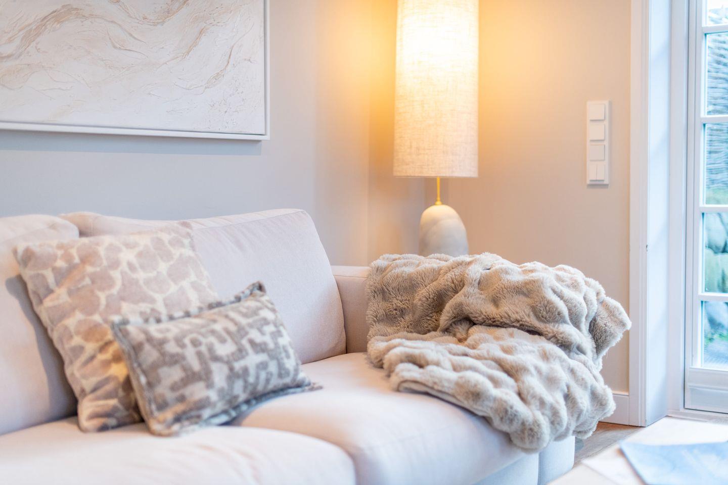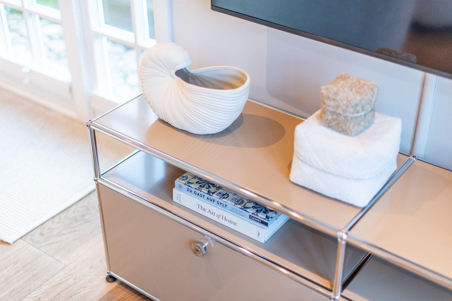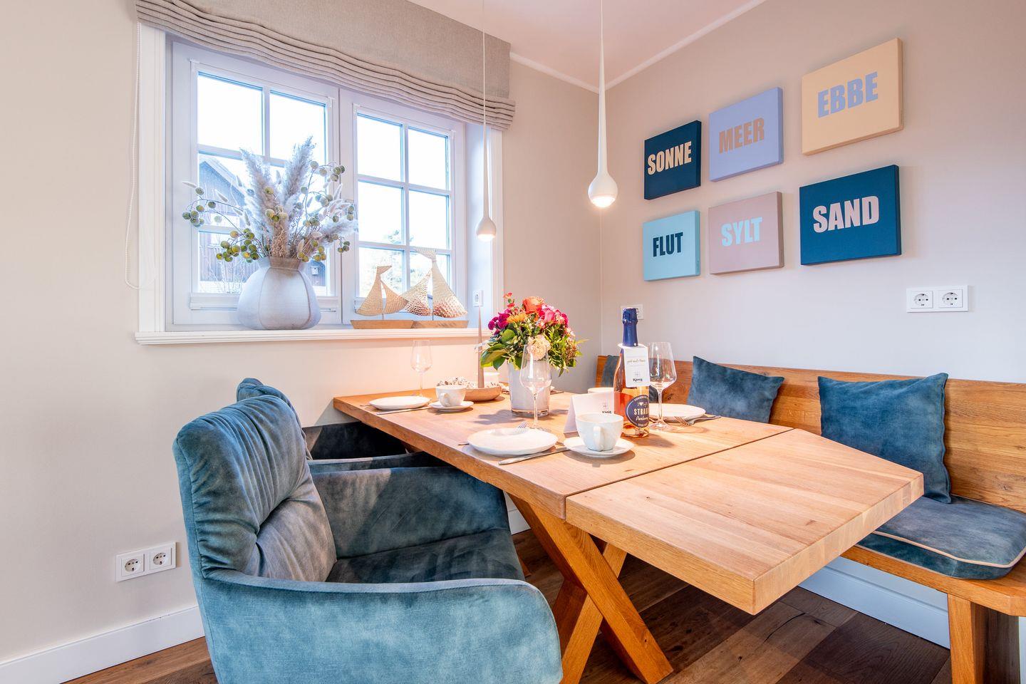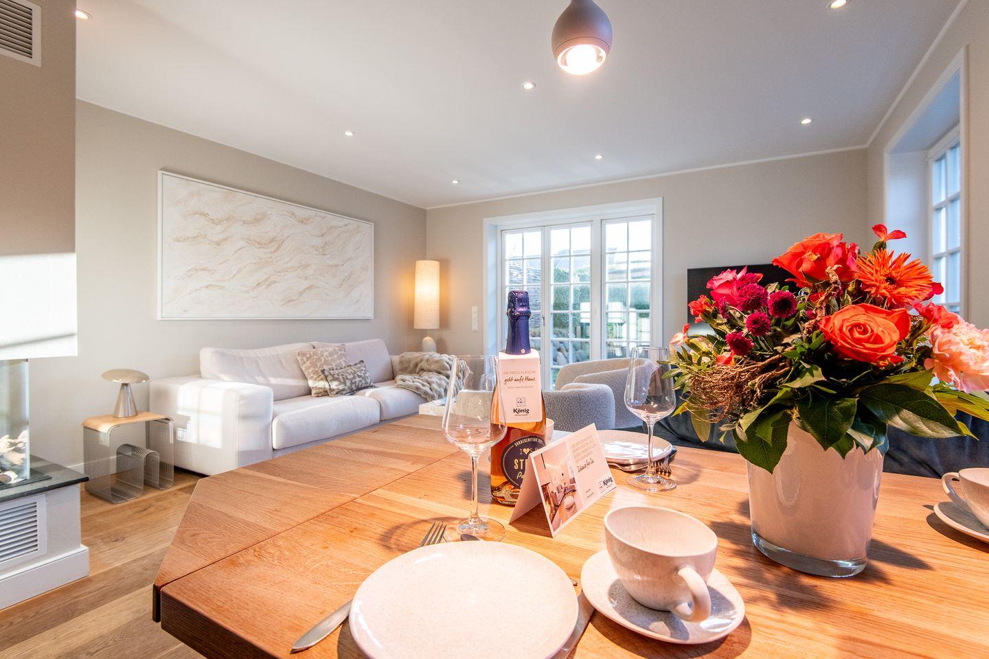 Der elegante Wohnbereich lädt mit einer gemütlichen Couch, zwei Sesseln, TV und einem modernen Gaskamin zum Verweilen ein. Der angrenzende Essbereich ist mit einem Esstisch, einer Sitzbank und drei Stühlen ausgestattet und bietet Platz für gesellige Abende. Von hier gelangen Sie direkt auf die möblierte Süd-Terrasse und in den kleinen Garten mit einem Saison-Strandkorb (April bis September) – perfekt, um die frische Meeresbrise zu genießen.
