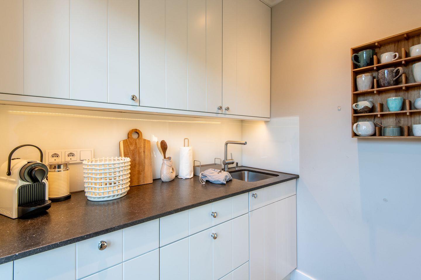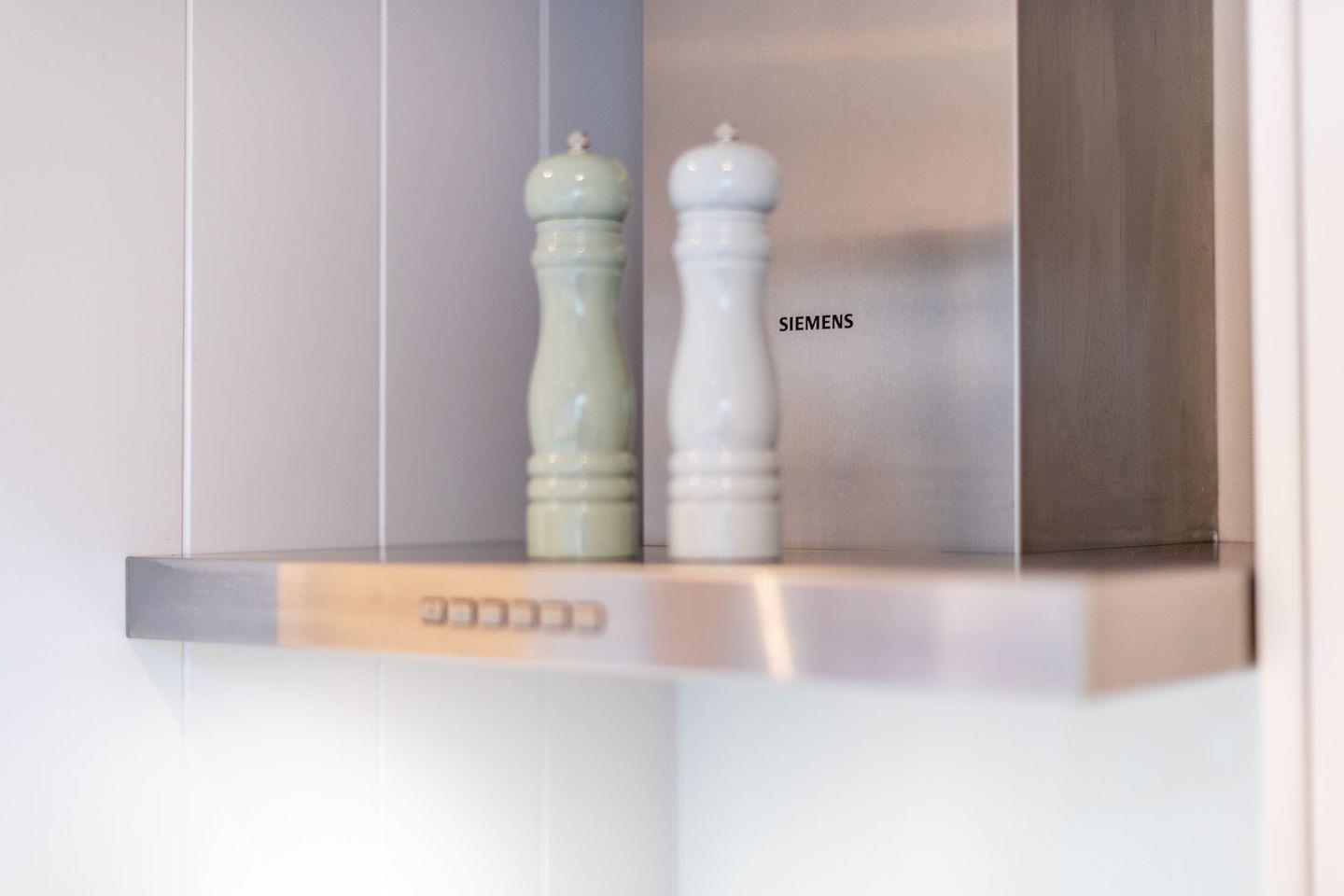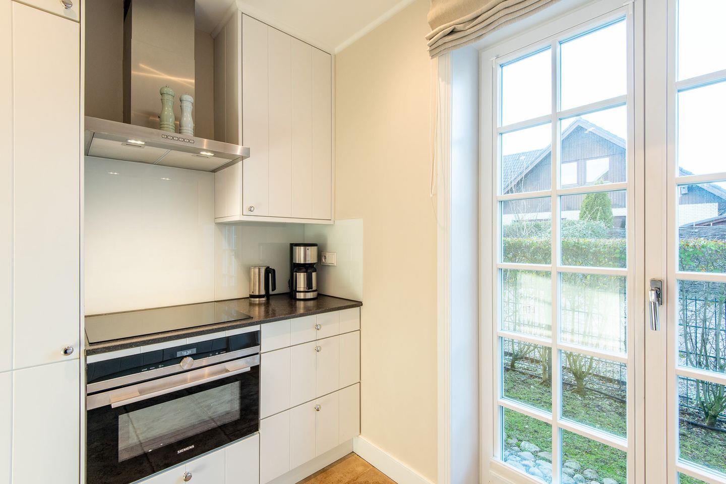 Die halboffene, moderne Küche ist mit hochwertigen Geräten ausgestattet und lässt keine Wünsche offen. Mit Cerankochfeld, Geschirrspüler, Filterkaffeemaschine und vielem mehr sorgt sie für eine angenehme Selbstversorgung und lädt zum gemeinsamen Kochen ein.