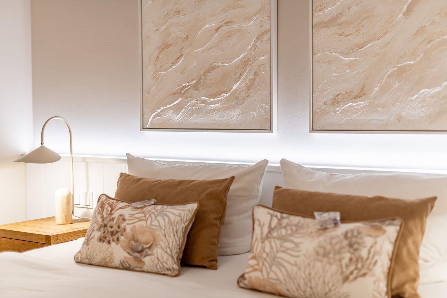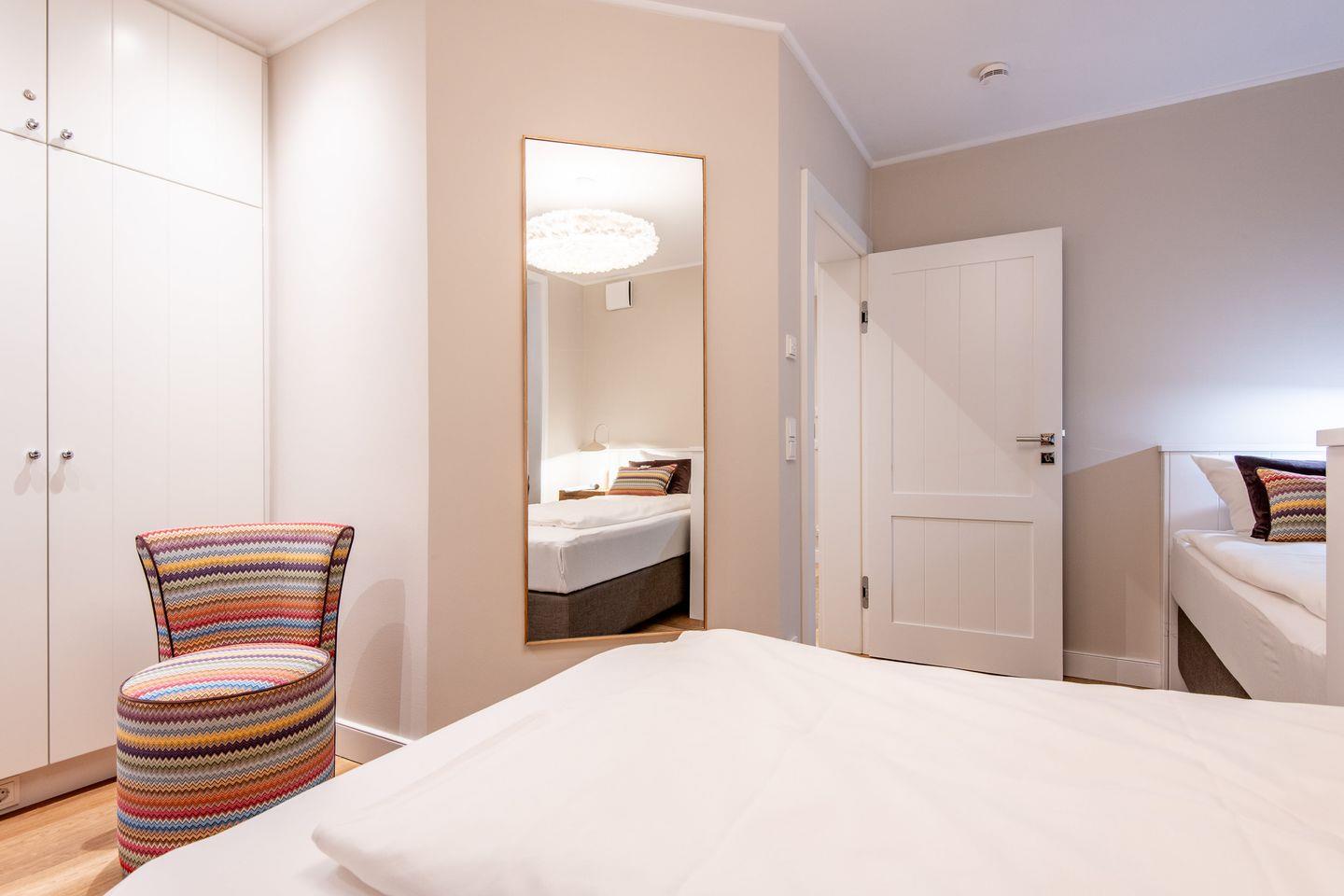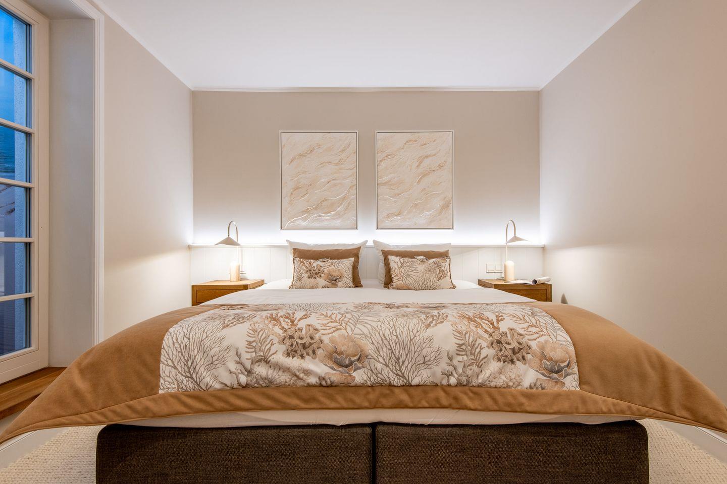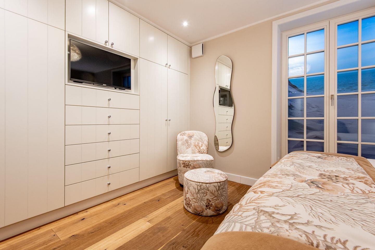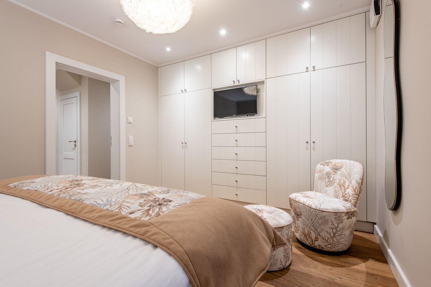 Das Hauptschlafzimmer bietet mit einem großzügigen Boxspring-Doppelbett (200x200 cm), einem Einbauschrank, zwei Sesseln und einem TV eine erholsame Atmosphäre. Das zweite Schlafzimmer ist mit zwei komfortablen Einzel-Boxspringbetten, ebenfalls einem Einbauschrank, zwei Sesseln und einem TV ausgestattet und eignet sich ideal für weitere Gäste oder Kinder.