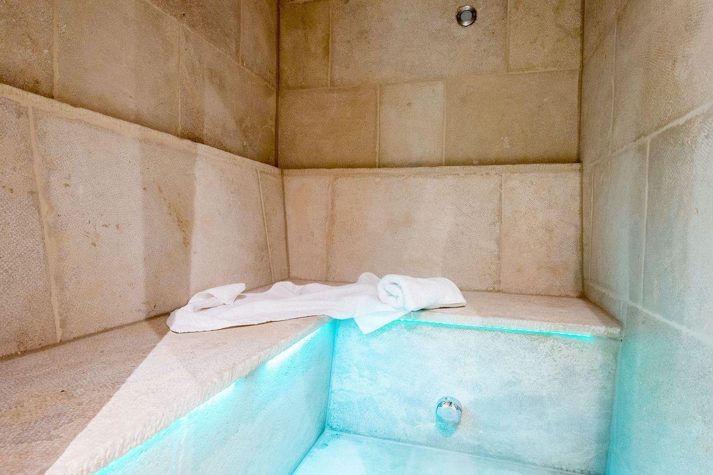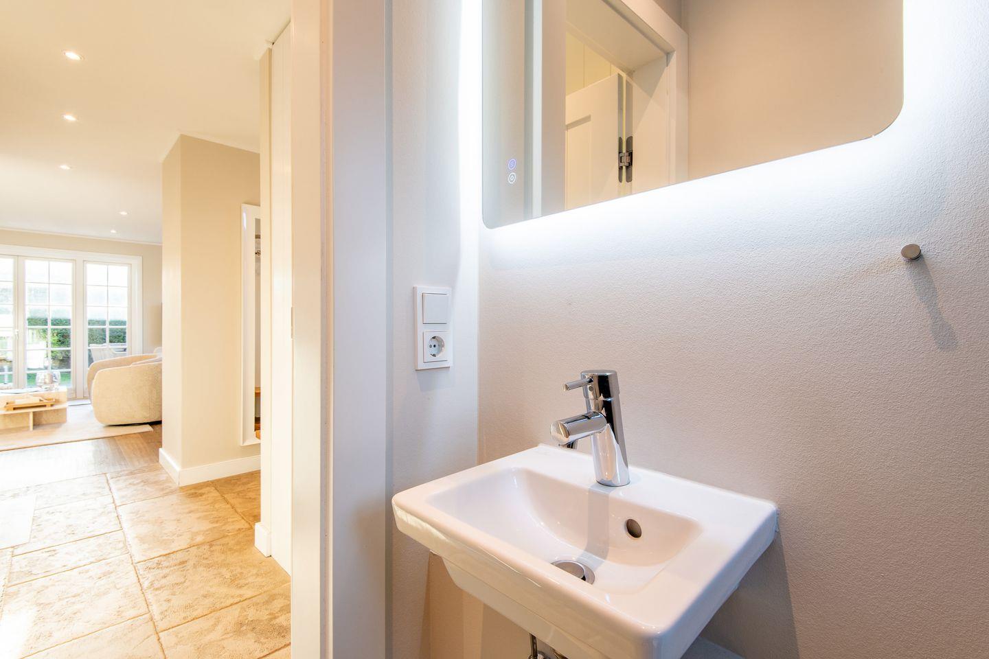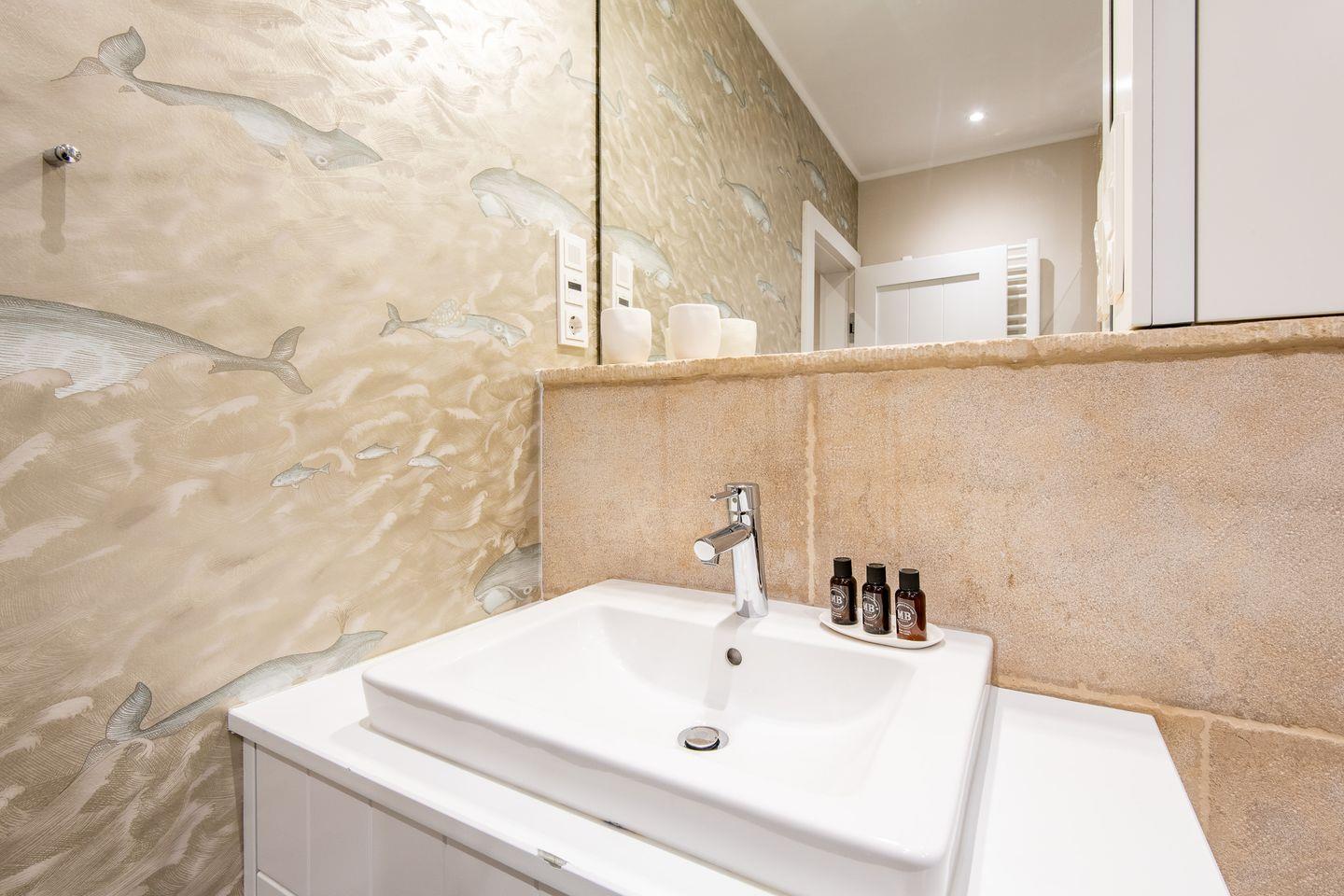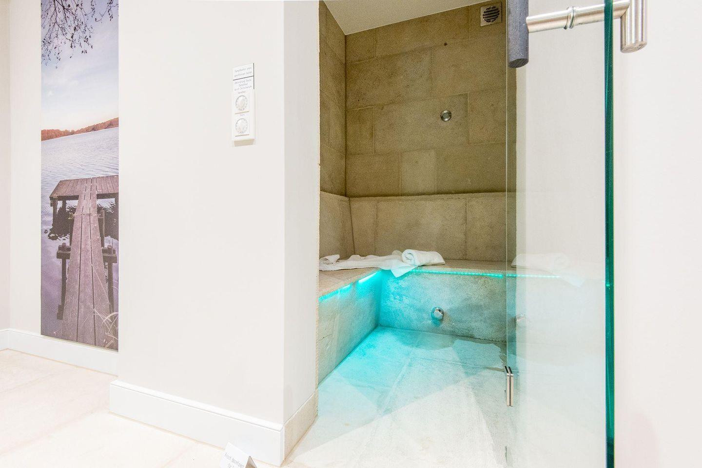 Das moderne Badezimmer verfügt über eine ebenerdige Dusche, WC, Handtuchwärmer, Föhn und Tageslicht. Ein separates Gäste-WC bietet zusätzlichen Komfort. Im gemeinschaftlichen Wellnessbereich des Hauses finden Sie eine Sauna, ein Dampfbad und eine erfrischende Schwalldusche – ideal zum Entspannen nach einem ereignisreichen Tag.