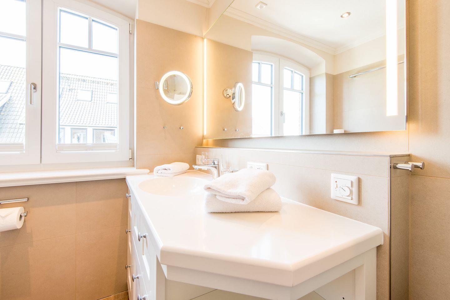 Das moderne Badezimmer verfügt über eine ebenerdige Regendusche, WC, Handtuchwärmer, Föhn und Tageslicht – ideal für entspannte Morgen- und Abendrituale.