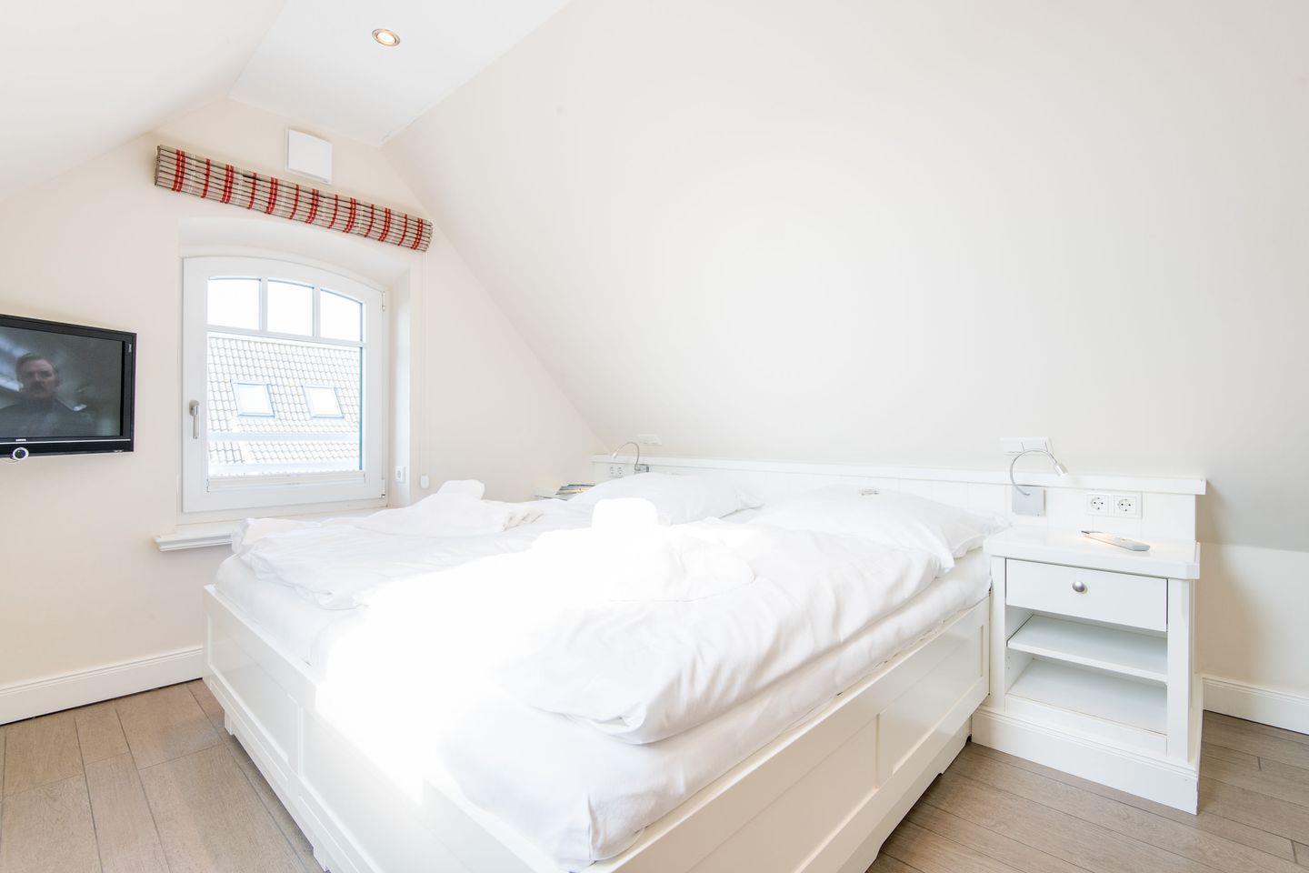 Das Hauptschlafzimmer verfügt über ein komfortables Doppelbett (2x 90x200 cm), ein Einbauschrank und einen TV. Der Blick aus dem Fenster reicht bis zu den Dünen – ein Highlight am Morgen. Das zweite Schlafzimmer ist mit einem etwas kleineren Doppelbett (140x200 cm), einem Einbauschrank und einem weiteren TV ausgestattet.
