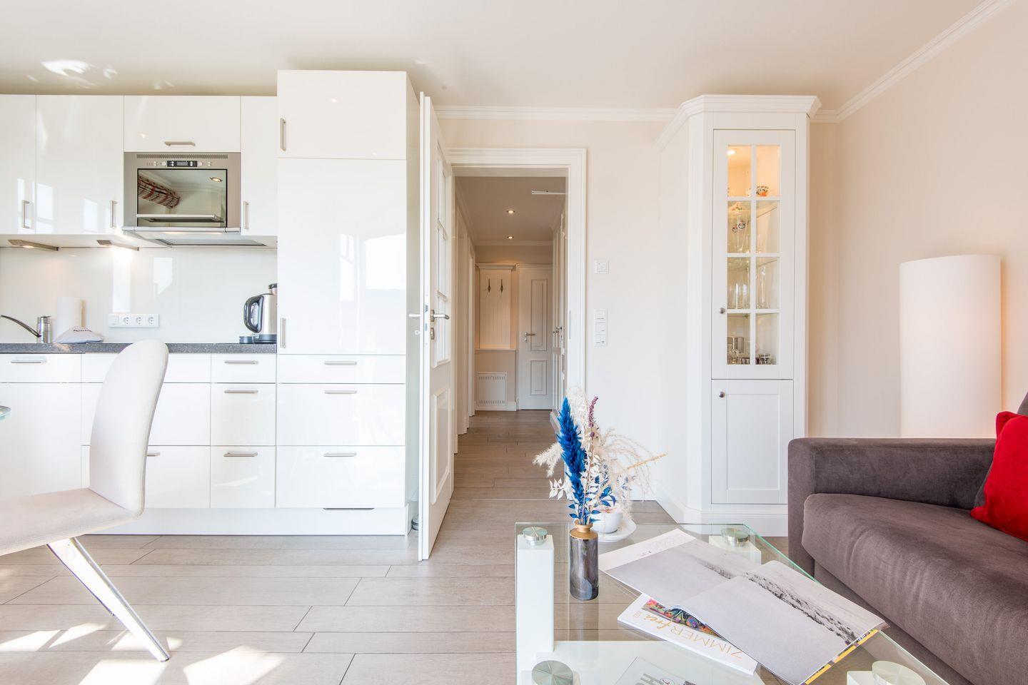 Das gemütliche Wohnzimmer ist mit einem Sofa, einem Sessel, einem Esstisch für 4 Personen und einem TV ausgestattet. Von hier aus gelangen Sie direkt auf den möblierten Balkon nach Westen, auf dem Sie sonnige Stunden und die frische Nordseeluft genießen können.