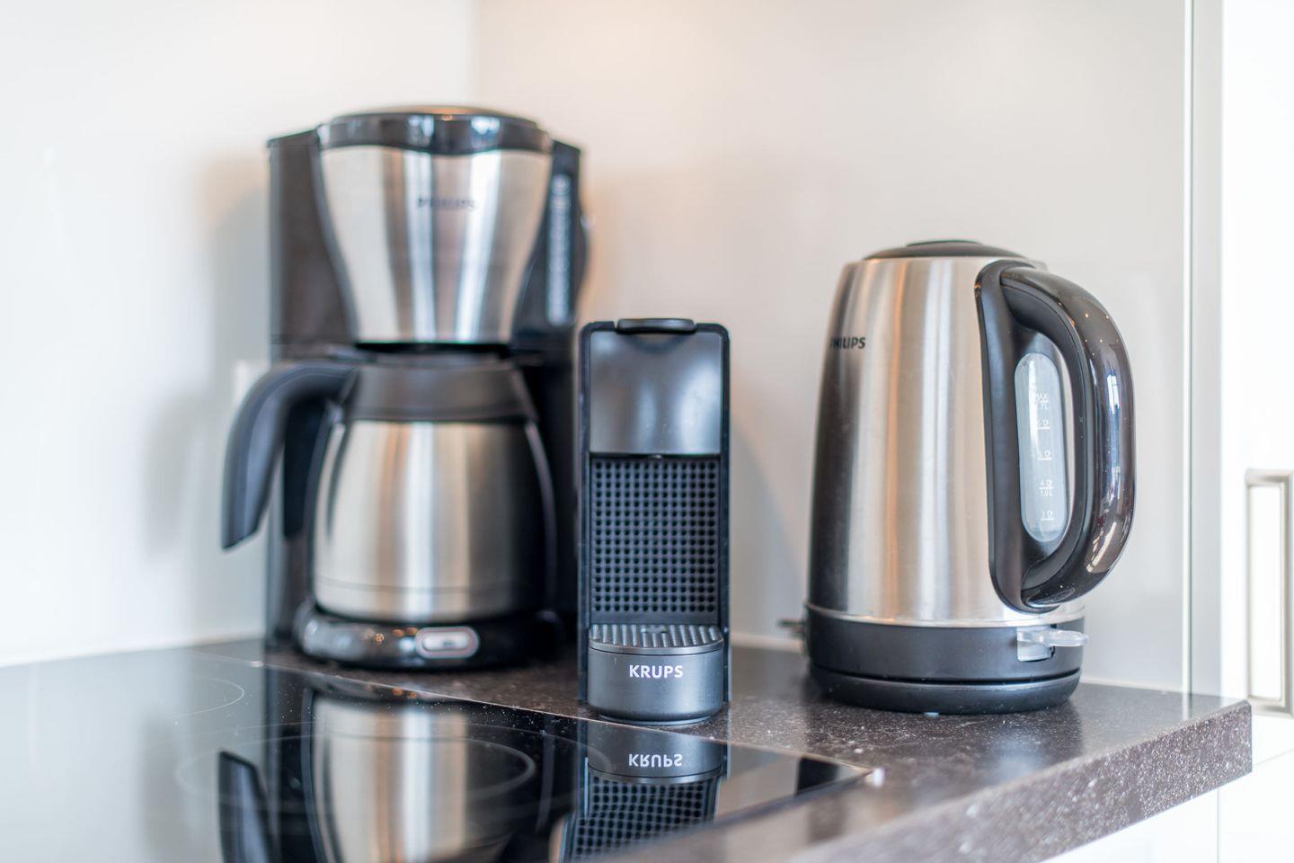 Die offene Küche ist modern ausgestattet und bietet alles, was Sie für die Zubereitung Ihrer Mahlzeiten benötigen. Zur Ausstattung gehören eine Filterkaffeemaschine, eine Nespresso-Maschine und weitere moderne Geräte.
