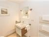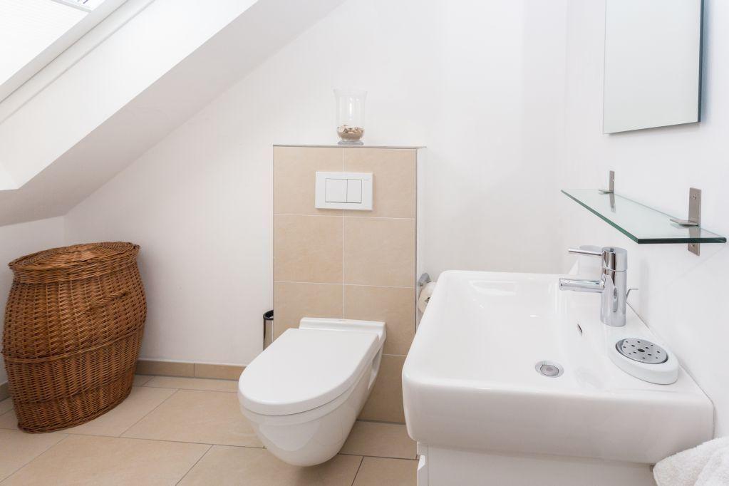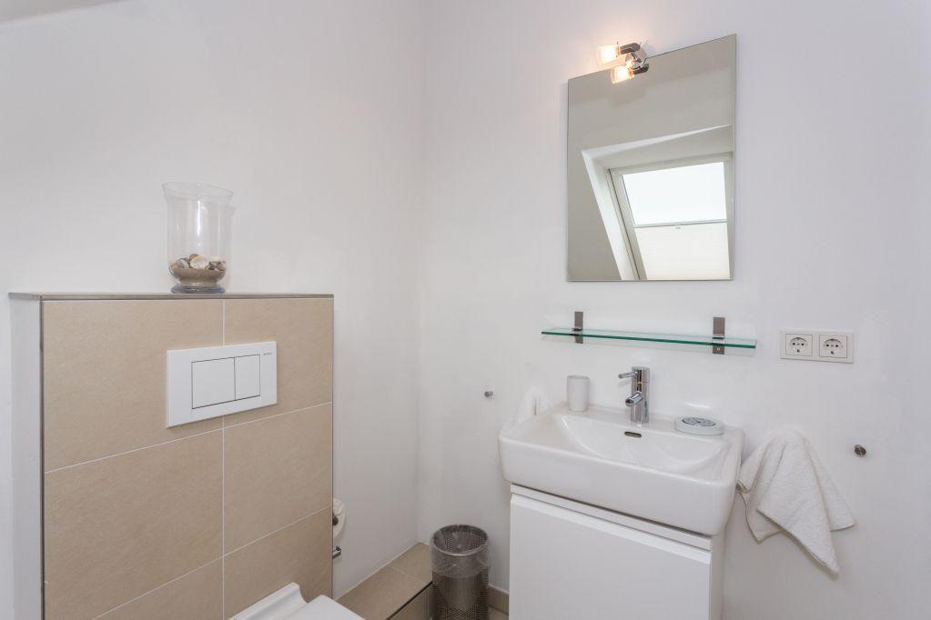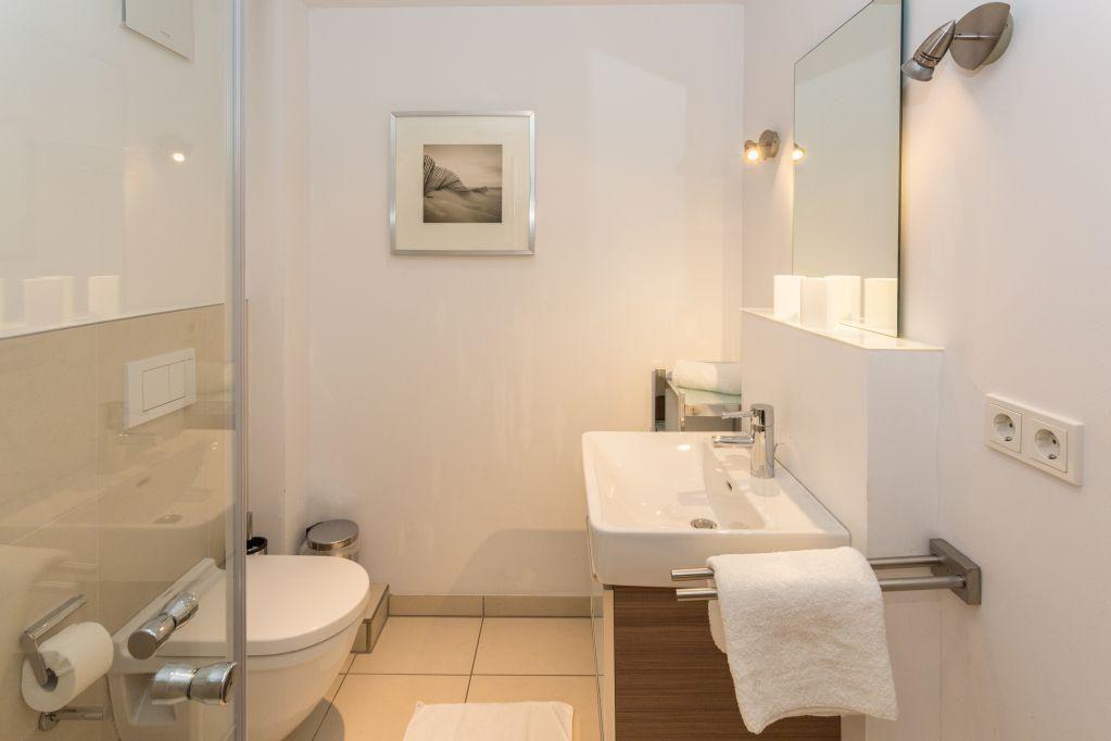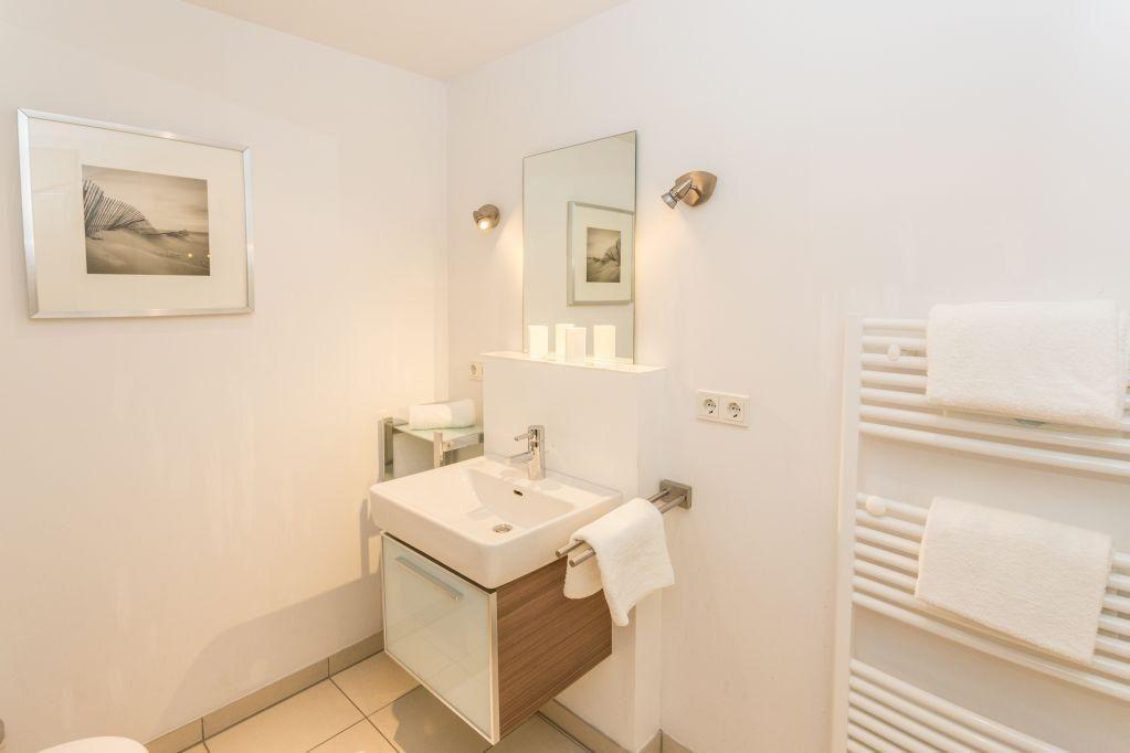 Das Badezimmer ist mit einer ebenerdigen Dusche, WC, Handtuchwärmer und Föhn ausgestattet und bietet eine komfortable Ausstattung. Zusätzlich steht im Eingangsbereich ein Gäste-WC zur Verfügung.