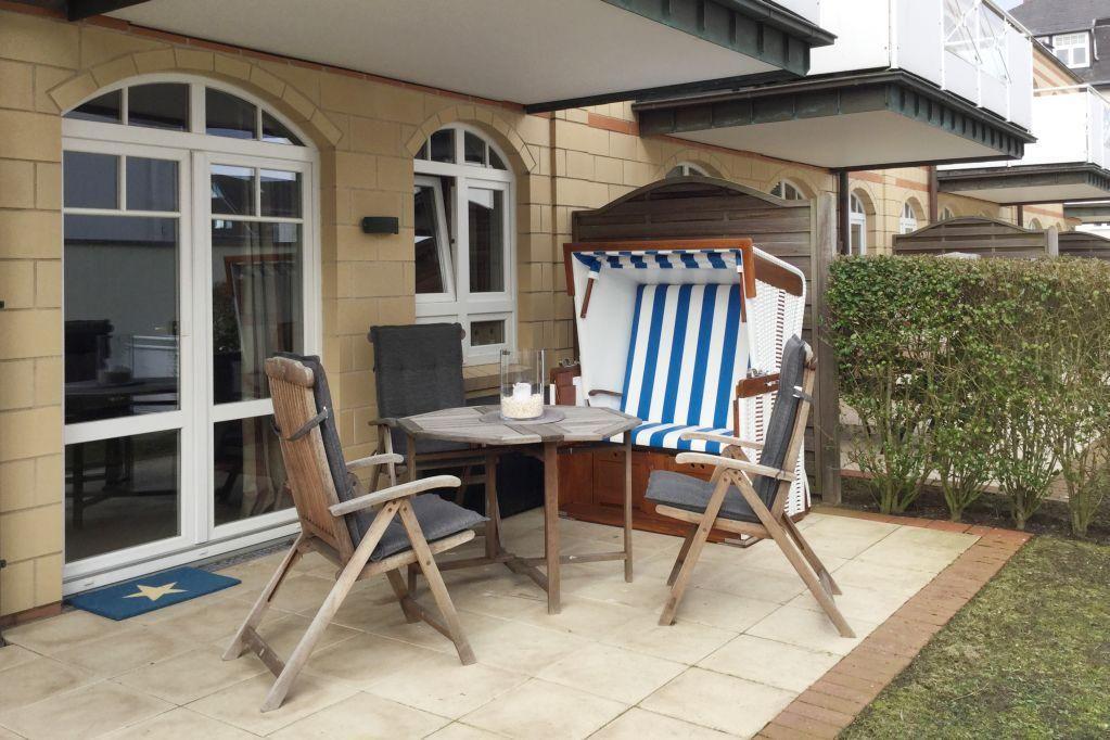 Das lichtdurchflutete Wohnzimmer ist mit einem bequemen Sofa, Sesseln, einem Esstisch für 4 Personen und einem TV ausgestattet. Von hier aus gelangen Sie direkt auf die möblierte Terrasse nach Süden, die mit einem Saisonstrandkorb (ca. Mai bis Oktober) ausgestattet ist – ideal zum Entspannen.