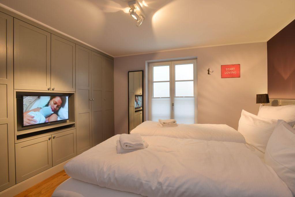 Das Schlafzimmer ist mit einem komfortablen Doppelbett (2x 90x200 cm) und praktischen Einbauschränken ausgestattet. Für Ihren Komfort stehen auch hochwertige Gel-Flocken-Kissen bereit. Ein TV sorgt für Unterhaltung und Entspannung im privaten Bereich.