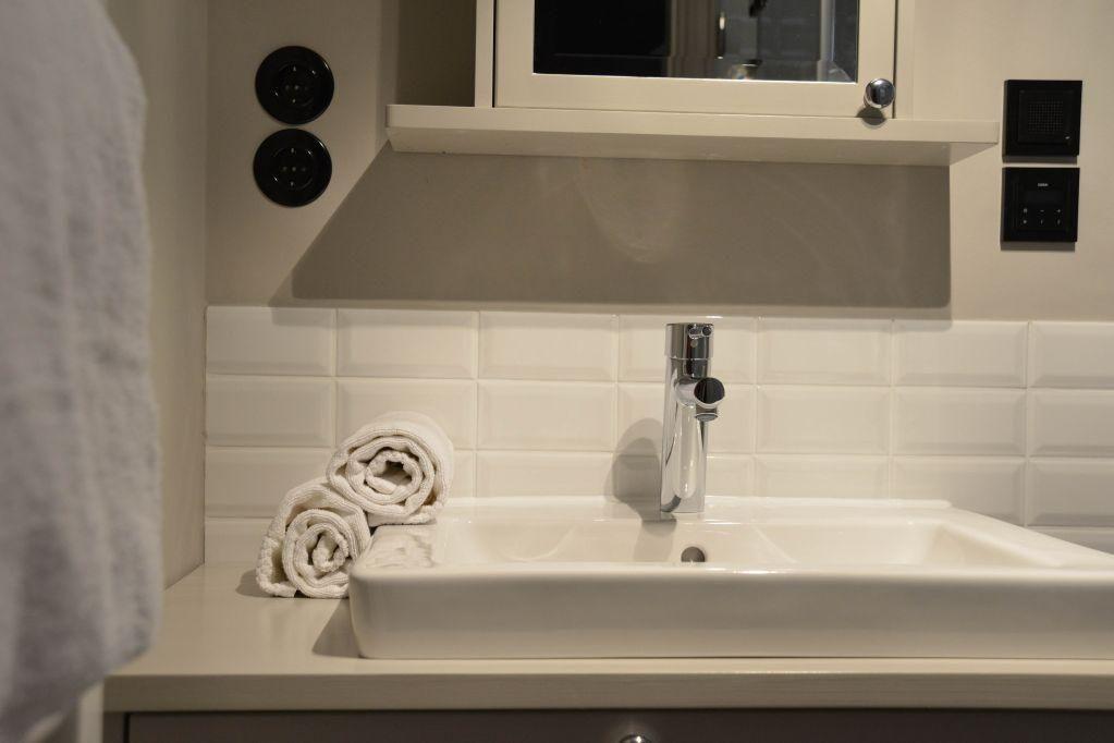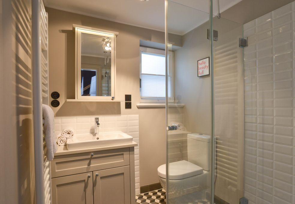 Das moderne Badezimmer überzeugt mit einer ebenerdigen Dusche, WC, Handtuchwärmer und Föhn, ideal für einen erfrischenden Start in den Tag. Nach einem langen Strandtag können Sie im gemeinschaftlichen Wellnessbereich des Hauses mit Sauna und Dampfbad entspannen und neue Energie tanken.