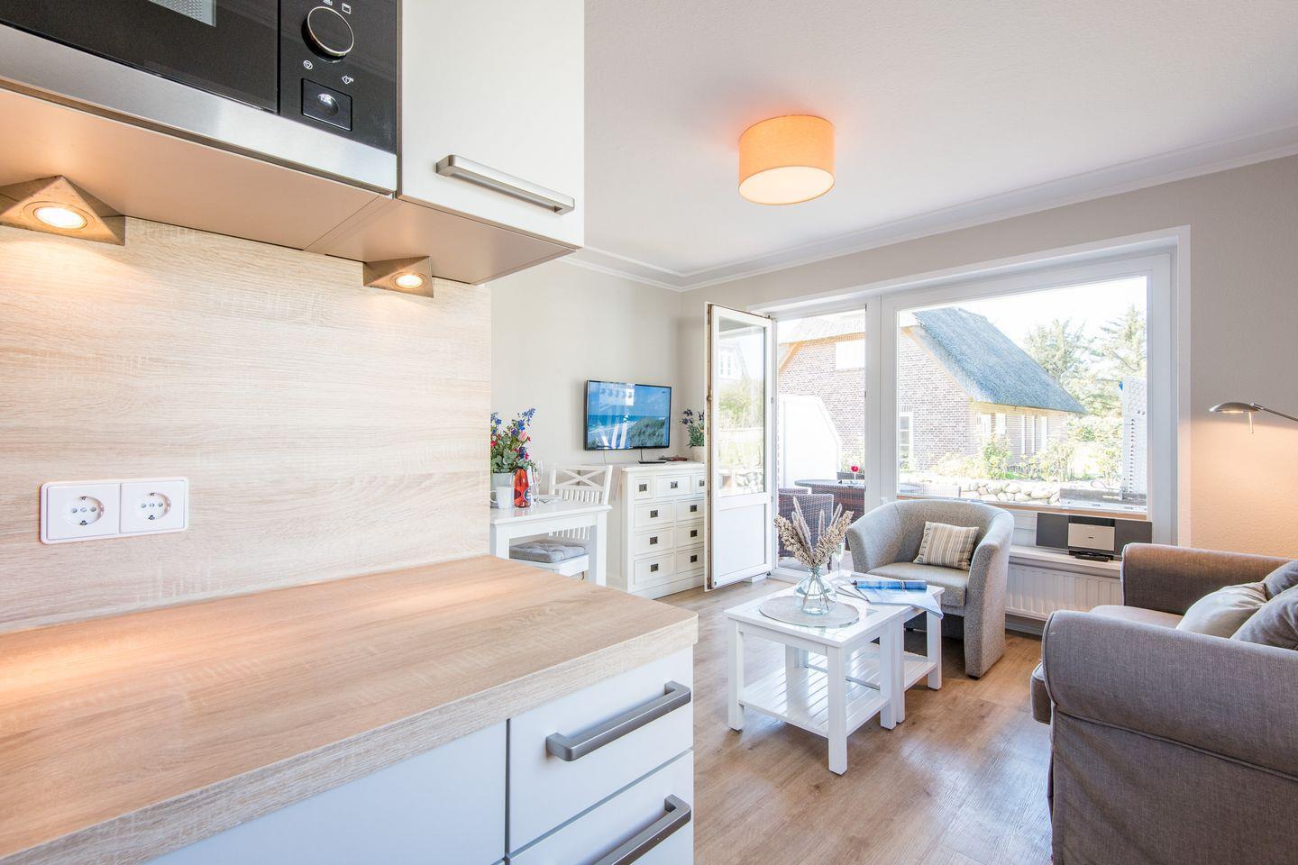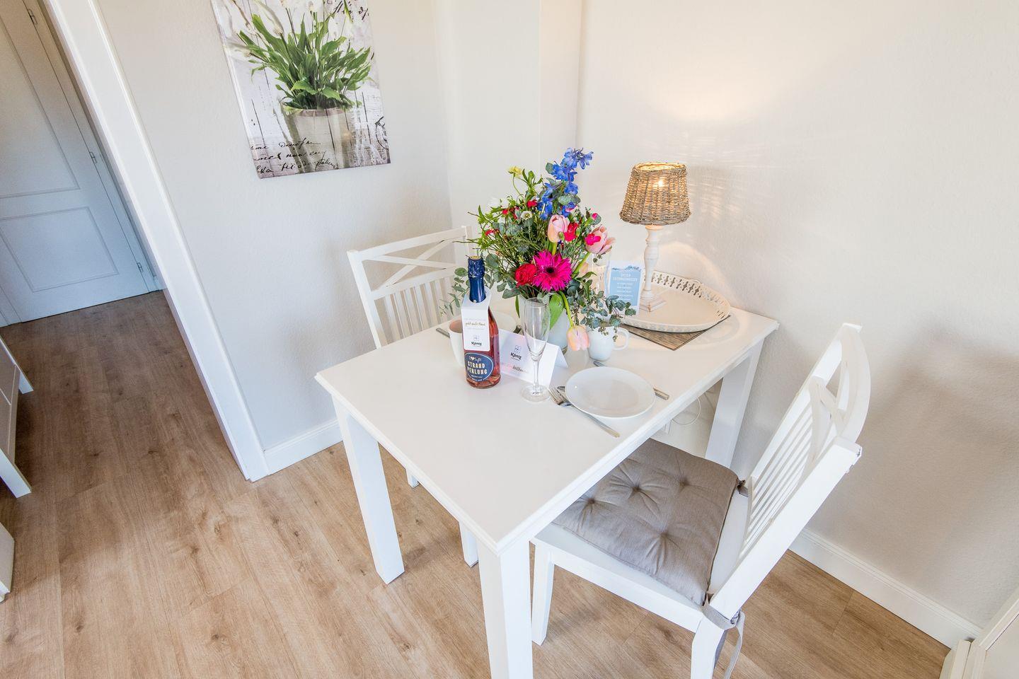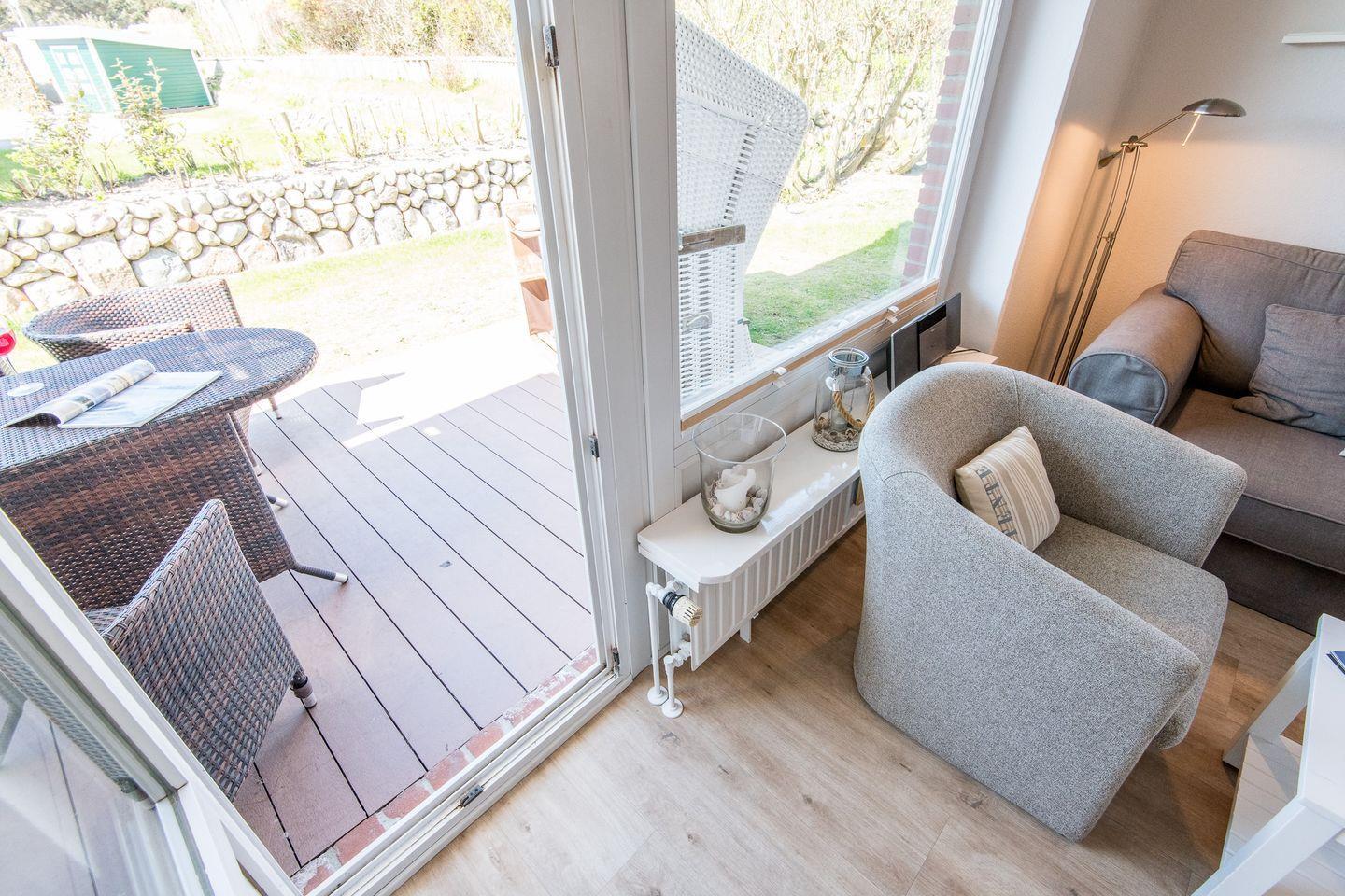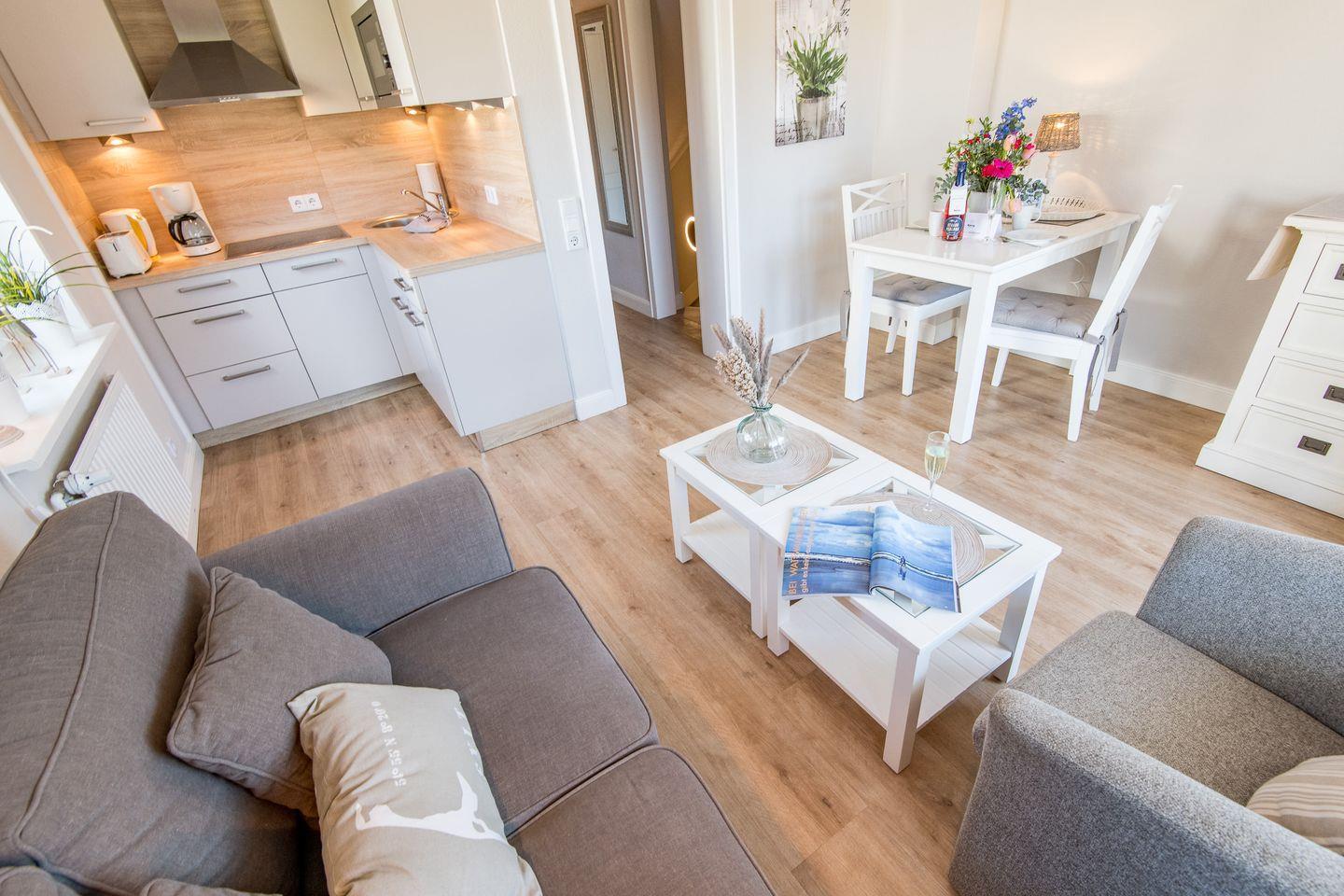 Das einladende Wohnzimmer ist mit einem gemütlichen Sofa, einem Korbsessel und einem TV ausgestattet. Die Essecke mit Tisch und zwei Stühlen lädt zu gemütlichen Mahlzeiten ein. Von hier aus gelangen Sie auf die möblierte West-Terrasse mit Saison-Strandkorb (ca. April-September), wo Sie den Abend entspannt ausklingen lassen können.