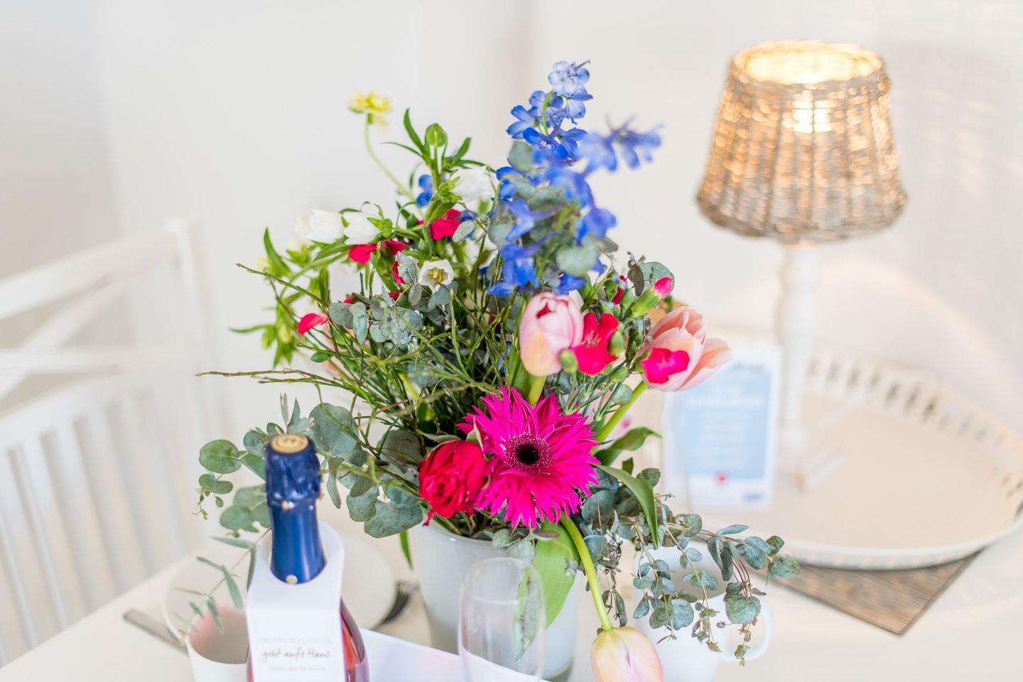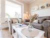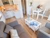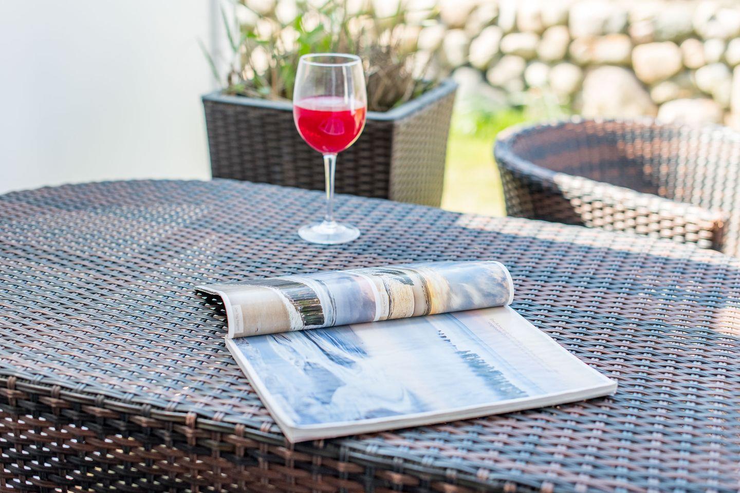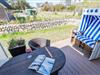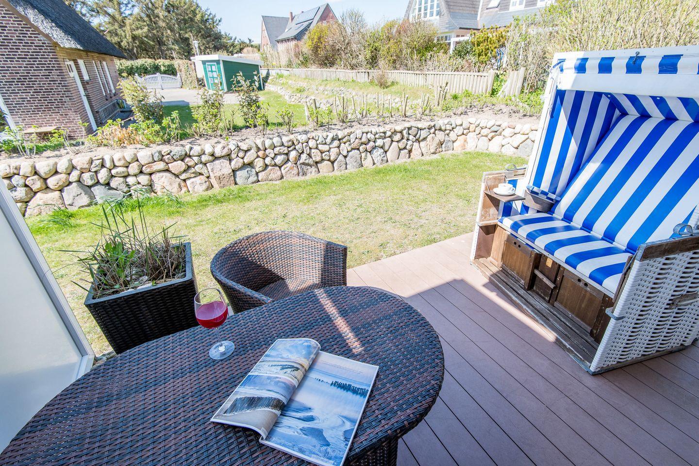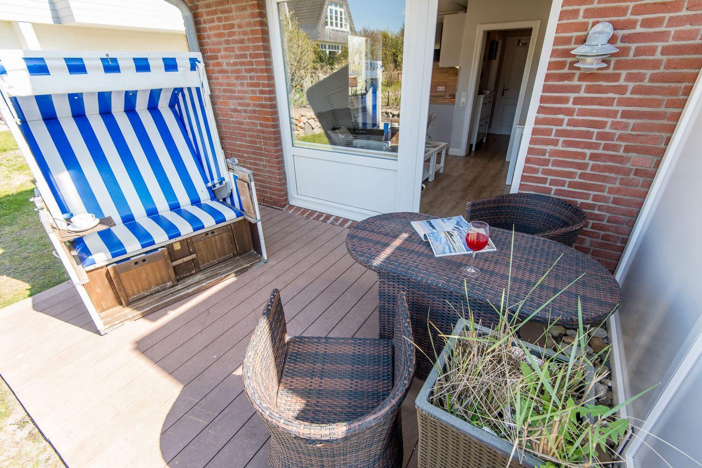 Das einladende Wohnzimmer ist mit einem gemütlichen Sofa, einem Korbsessel und einem TV ausgestattet. Die Essecke mit Tisch und zwei Stühlen lädt zu gemütlichen Mahlzeiten ein. Von hier aus gelangen Sie auf die möblierte West-Terrasse mit Saison-Strandkorb (ca. April-September), wo Sie den Abend entspannt ausklingen lassen können.