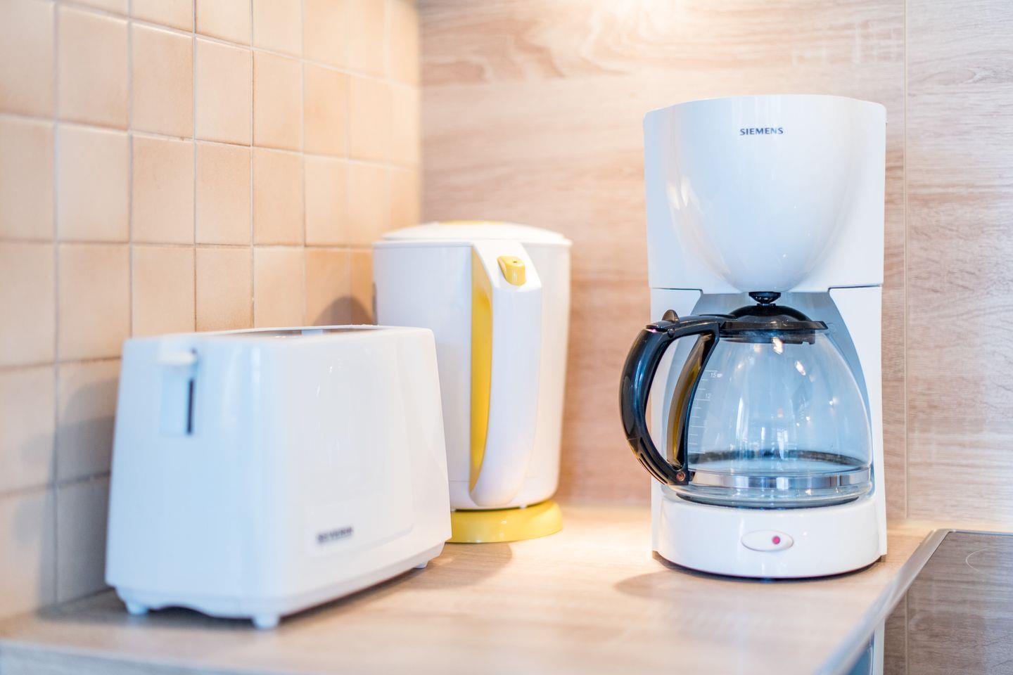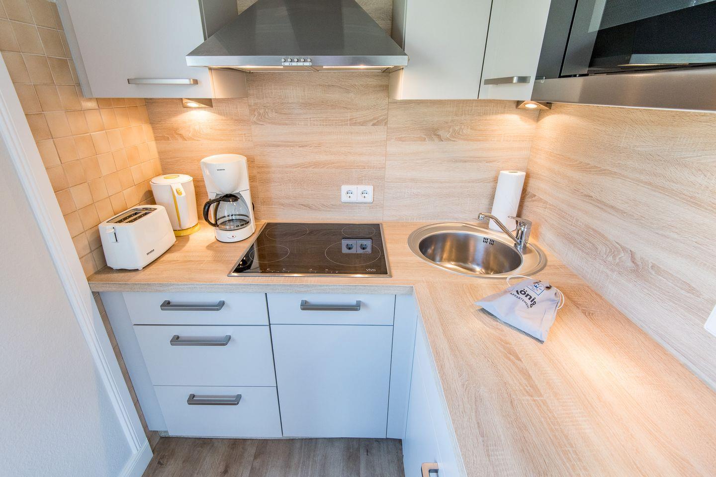 Die offene Einbauküche ist modern ausgestattet und bietet alles, was Sie benötigen. Mit Cerankochfeld, Mikrowelle, Geschirrspüler und einer Filterkaffeemaschine ist die Küche perfekt für Selbstversorger.