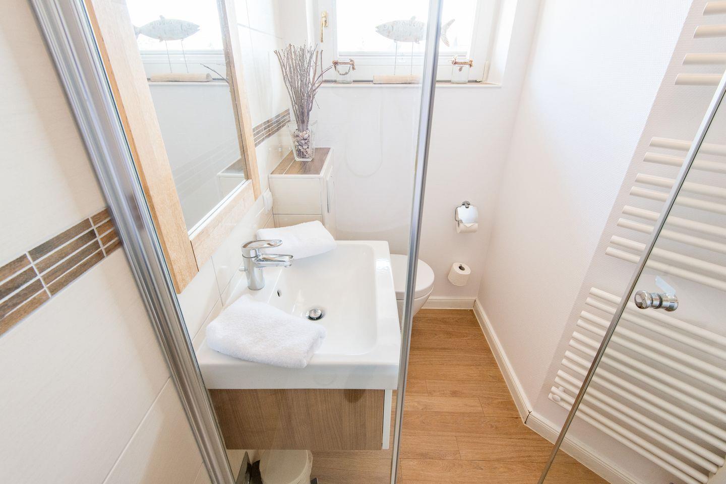 Im Eingangsbereich gibt es einen kleinen Flur mit Garderobe. Zur kostenfreien Nutzung stehen eine Waschmaschine und ein Trockner, zur gemeinschaftlichen Nutzung, im Haus zur Verfügung. WLAN (ohne Gewähr) und ein Pkw-Stellplatz sind vorhanden. Hunde sind willkommen.