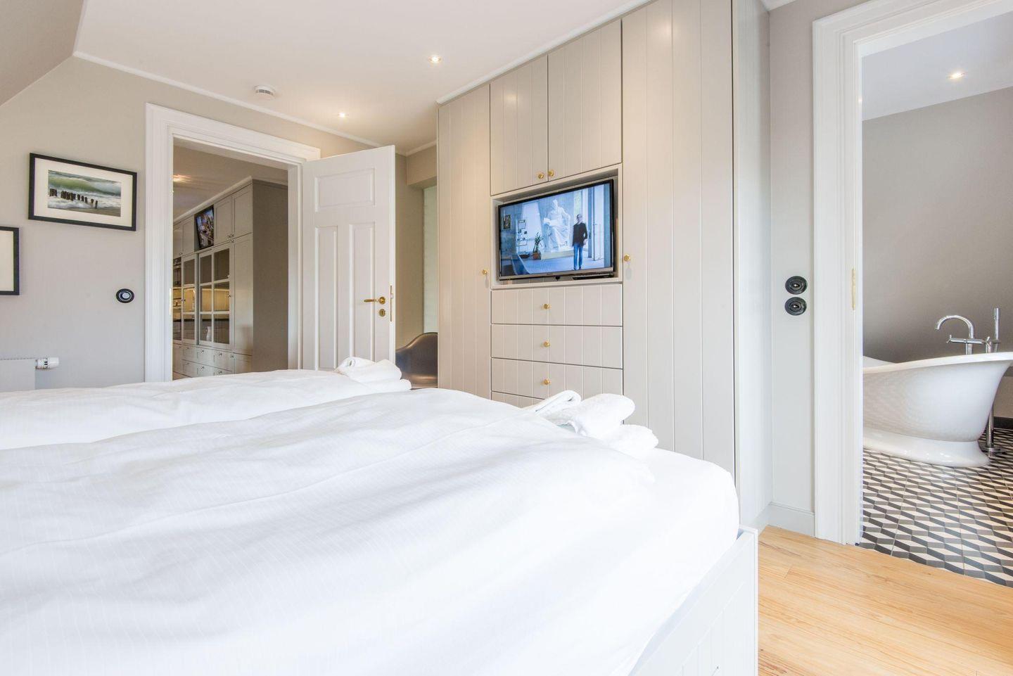 Im Obergeschoss erwartet Sie das erste Schlafzimmer, ausgestattet mit einem luxuriösen Doppelbett (2x 100x200 cm), einem geräumigen Einbauschrank, TV und einem eigenen Balkon nach Osten. Dieses Schlafzimmer verfügt über ein angrenzendes Badezimmer mit Badewanne, ebenerdiger Dusche, WC, zwei Waschbecken, Handtuchwärmer, Föhn und Tageslicht, das Ihnen reichlich Raum und Privatsphäre bietet.