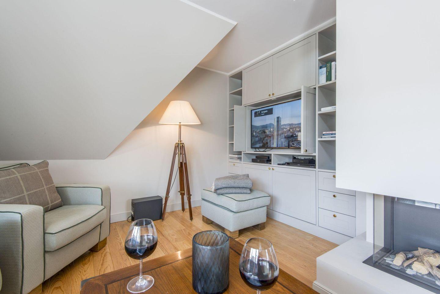 Das lichtdurchflutete Wohnzimmer im Loftstil besticht mit hohen Decken und sichtbarem Gebälk, das eine besondere Atmosphäre schafft. Der Kamin sorgt für gemütliche Stunden, während die Sofaecke und der TV einladen, die Abende entspannt zu genießen. Von hier aus haben Sie direkten Zugang zur großzügigen, windgeschützten Dachterrasse nach Süden, die mit bequemen Gartenmöbeln ausgestattet ist.