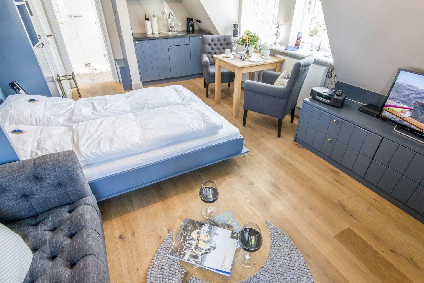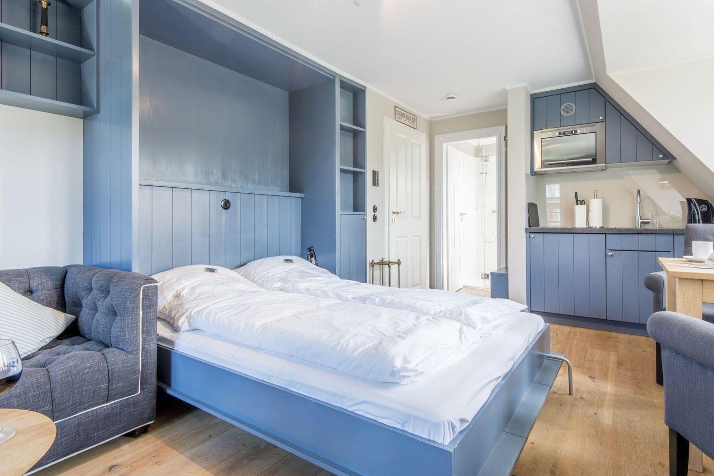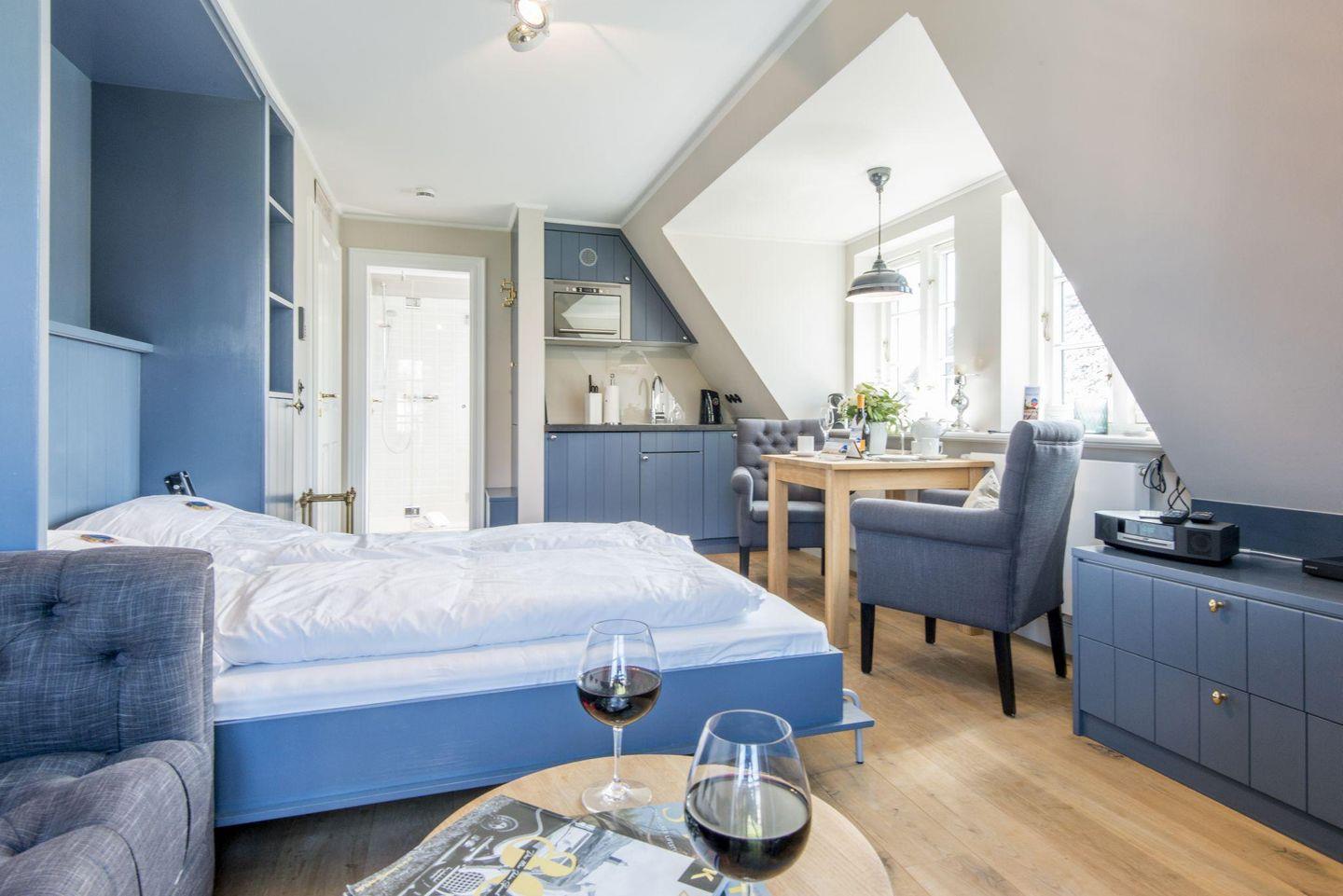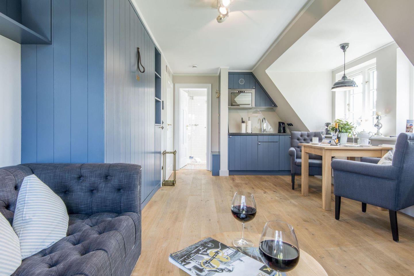 Die stilvolle 1-Zimmer-Ferienwohnung *Blauer Salon* im ersten Obergeschoss der Villa Maybach bietet auf ca. 30 m² Raum für bis zu 2 Personen. Die zentrale Lage in Westerland auf Sylt und die hochwertige Ausstattung mit exklusivem Wellnessbereich machen dieses Domizil zur perfekten Wahl für entspannte Urlaubstage. Einladend gestaltet und lichtdurchflutet, sorgt die Wohnung mit einem Balkon nach Westen und einem Sonnenfreisitz mit Strandkorb für wohltuende Entspannungsmomente.