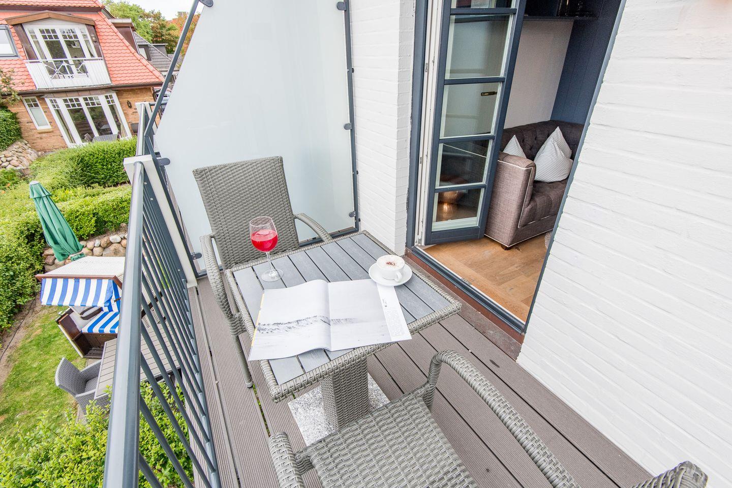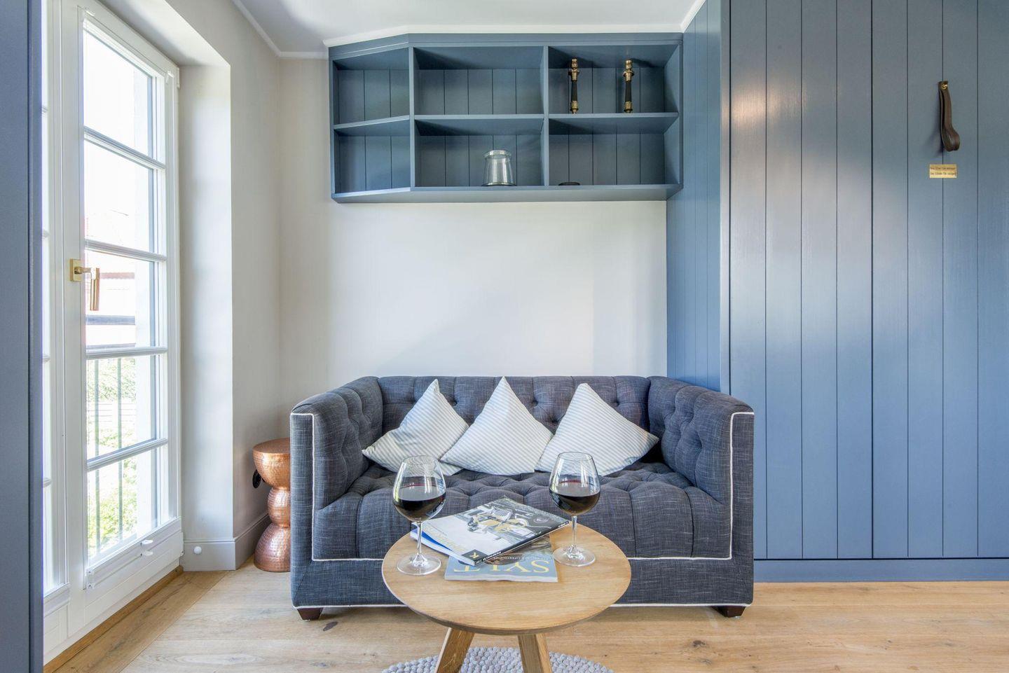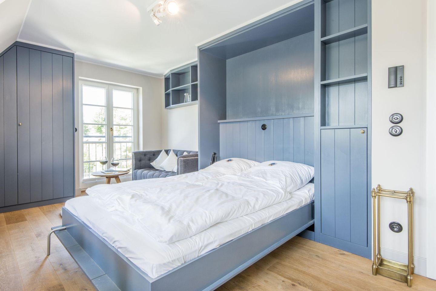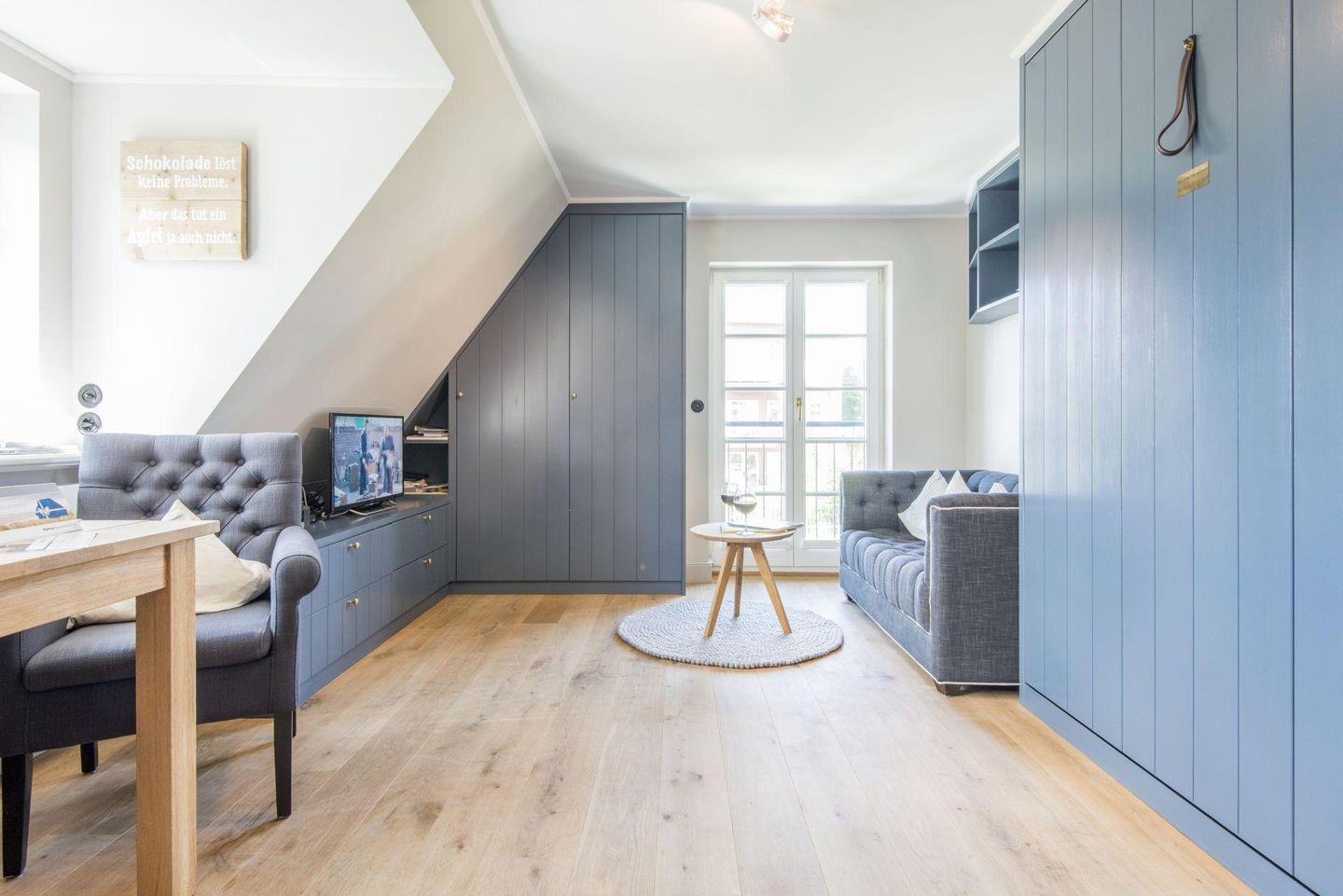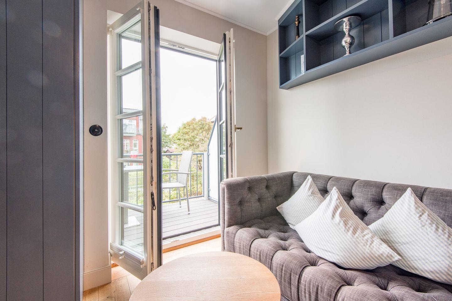 Die stilvolle 1-Zimmer-Ferienwohnung *Blauer Salon* im ersten Obergeschoss der Villa Maybach bietet auf ca. 30 m² Raum für bis zu 2 Personen. Die zentrale Lage in Westerland auf Sylt und die hochwertige Ausstattung mit exklusivem Wellnessbereich machen dieses Domizil zur perfekten Wahl für entspannte Urlaubstage. Einladend gestaltet und lichtdurchflutet, sorgt die Wohnung mit einem Balkon nach Westen und einem Sonnenfreisitz mit Strandkorb für wohltuende Entspannungsmomente.