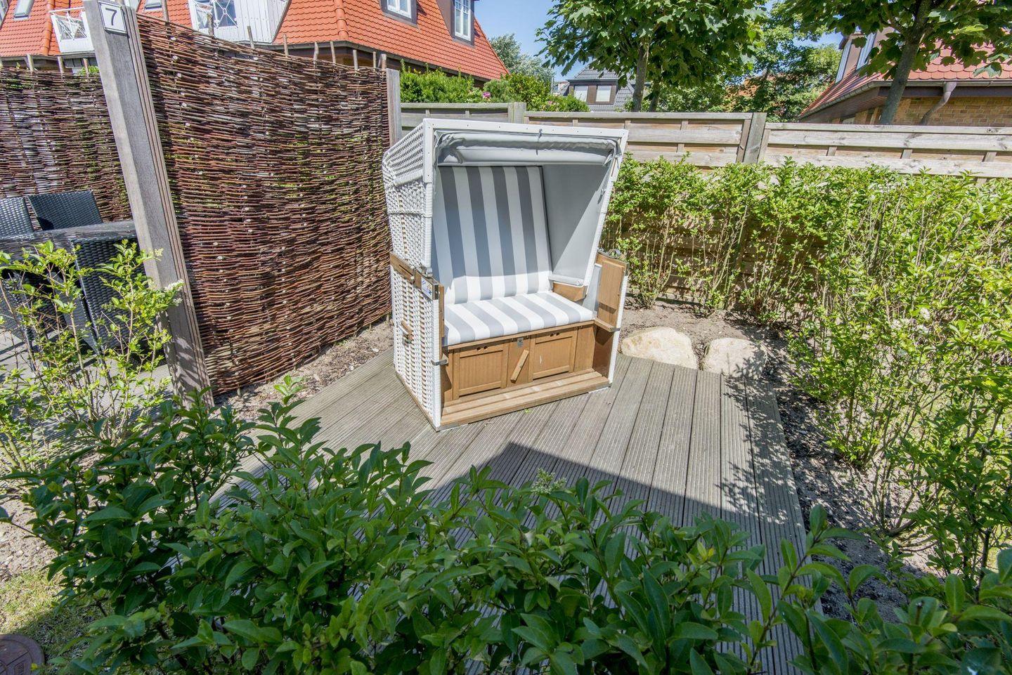 Wohnzimmer mit Schrankbett, 1 Badezimmer mit Dusche, offene Küche zum Wohn-/Essbereich mit Zugang zum West-Balkon, Sonnenfreisitz mit Strandkorb, gemeinschaftlicher Wellnessbereich mit Sauna, Waschmaschine und Trockner (gemeinschaftlich), PKW-Stellplatz, WLAN (ohne Gewähr) vorhanden, Hunde willkommen.