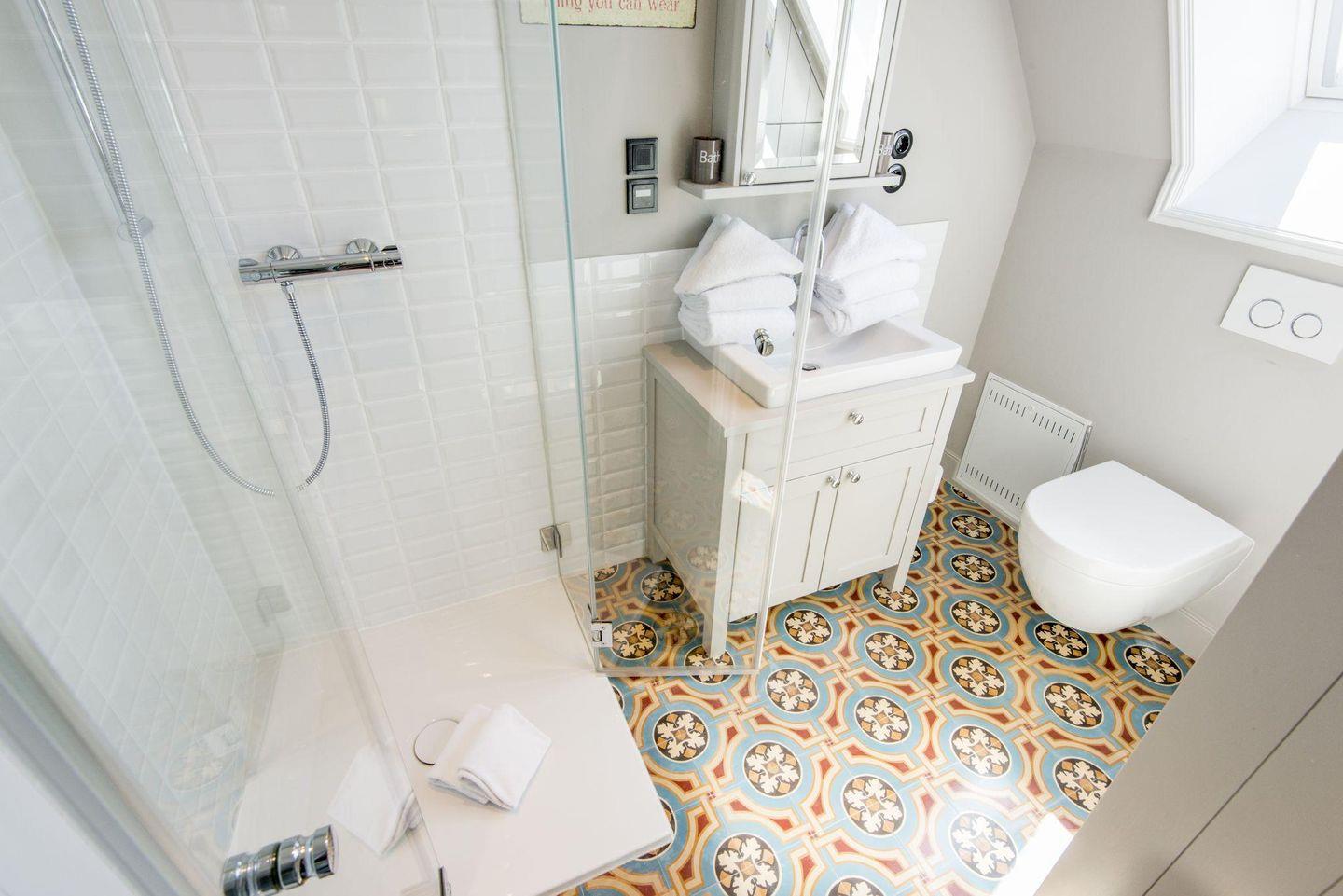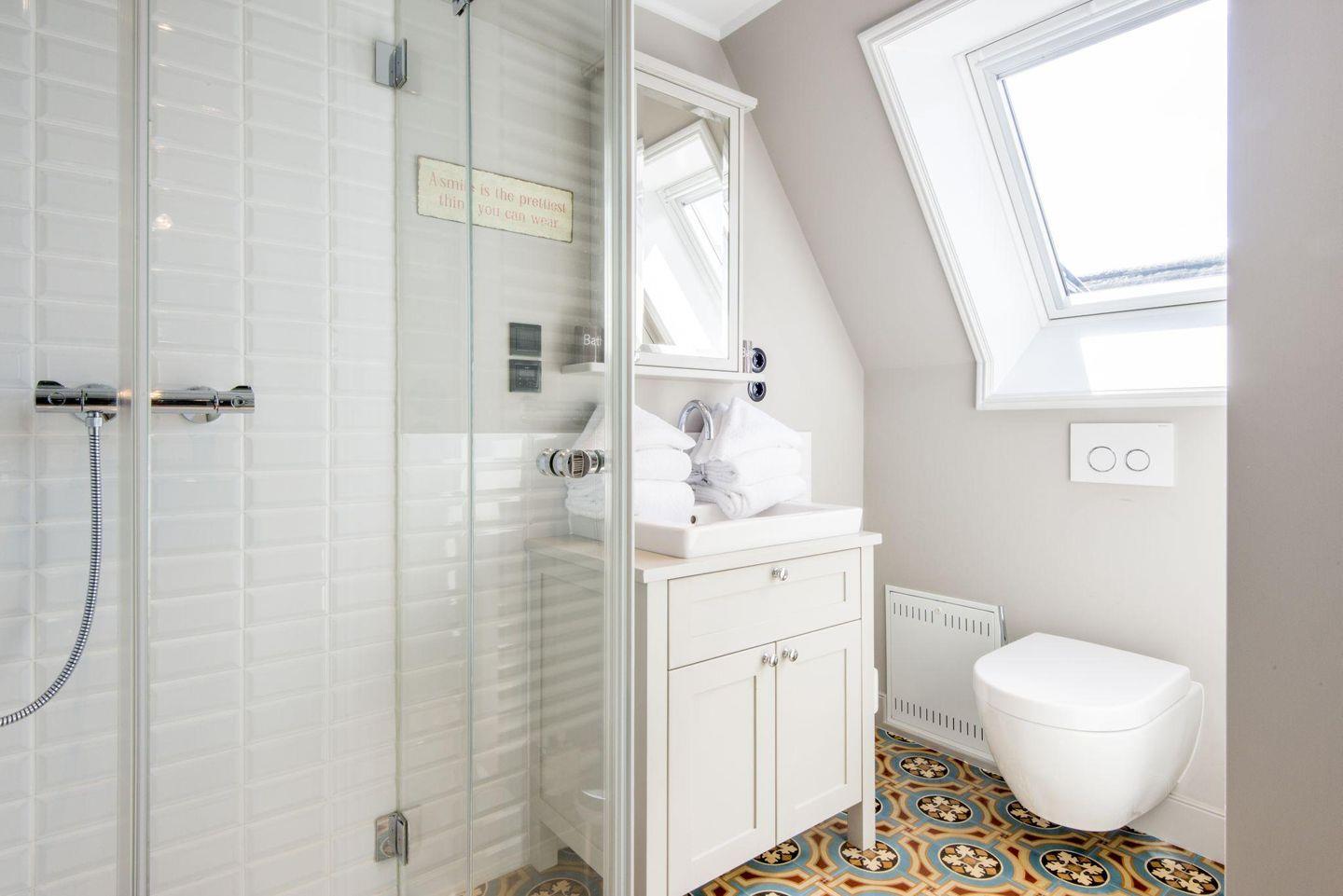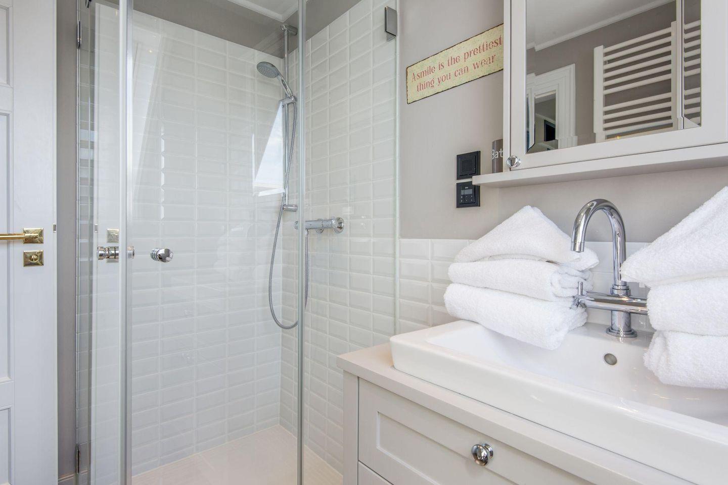 Das moderne Badezimmer überzeugt mit einer ebenerdigen Dusche, WC, Föhn und Handtuchwärmer – ideal für frische Starts in den Tag.