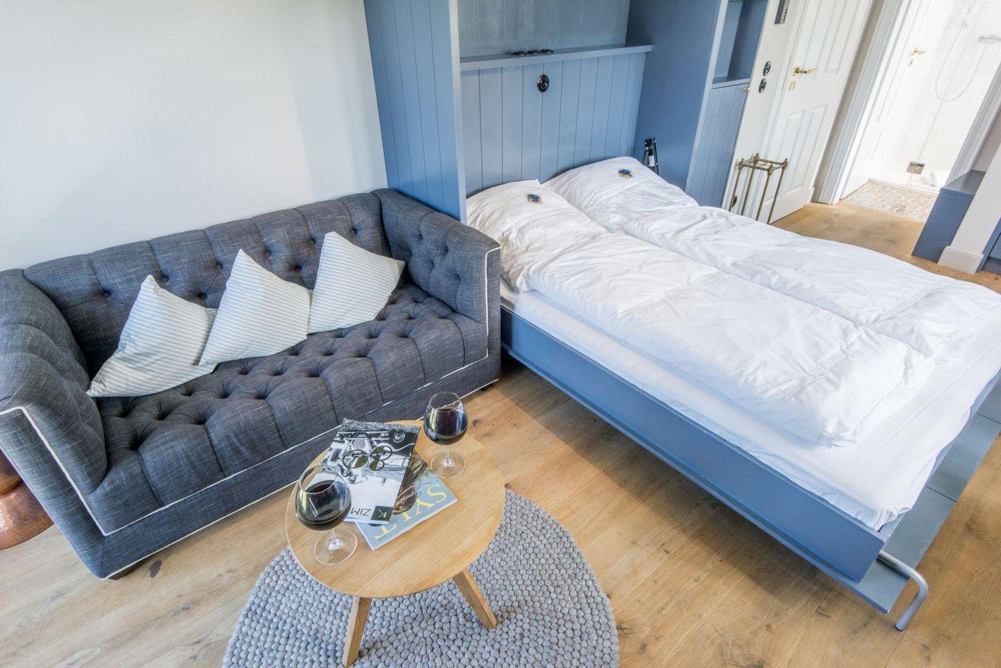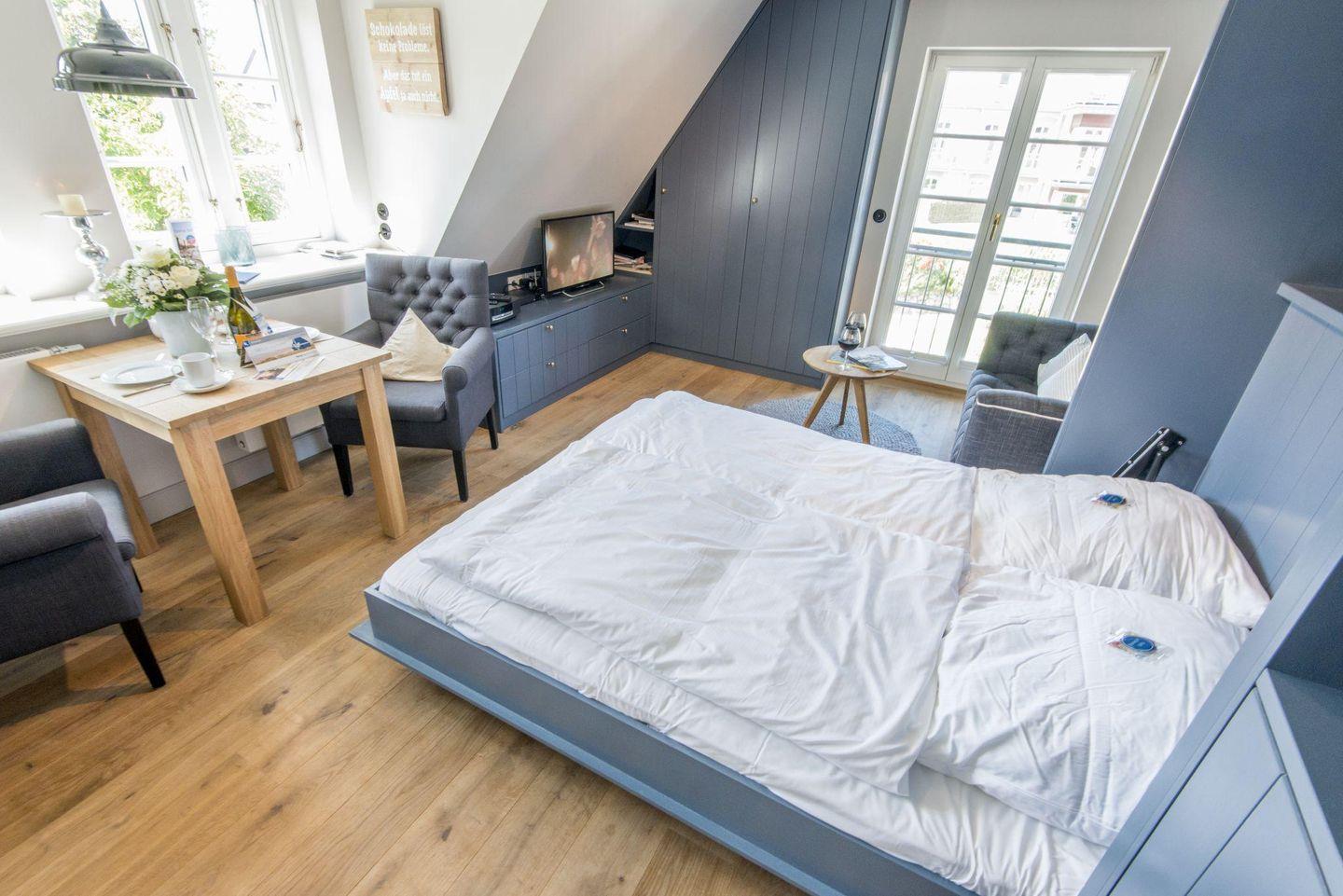 Der lichtdurchflutete Wohnbereich ist geschmackvoll und komfortabel eingerichtet. Das integrierte Schrankbett (150x200 cm) lässt sich platzsparend verstauen und verwandelt den Raum so spielend vom Schlafzimmer zum gemütlichen Wohnzimmer. Die stilvolle Sitzecke und der Esstisch für zwei Personen schaffen eine entspannte Atmosphäre, und der direkte Zugang zum Balkon ermöglicht es Ihnen, die Inselbrise zu genießen.