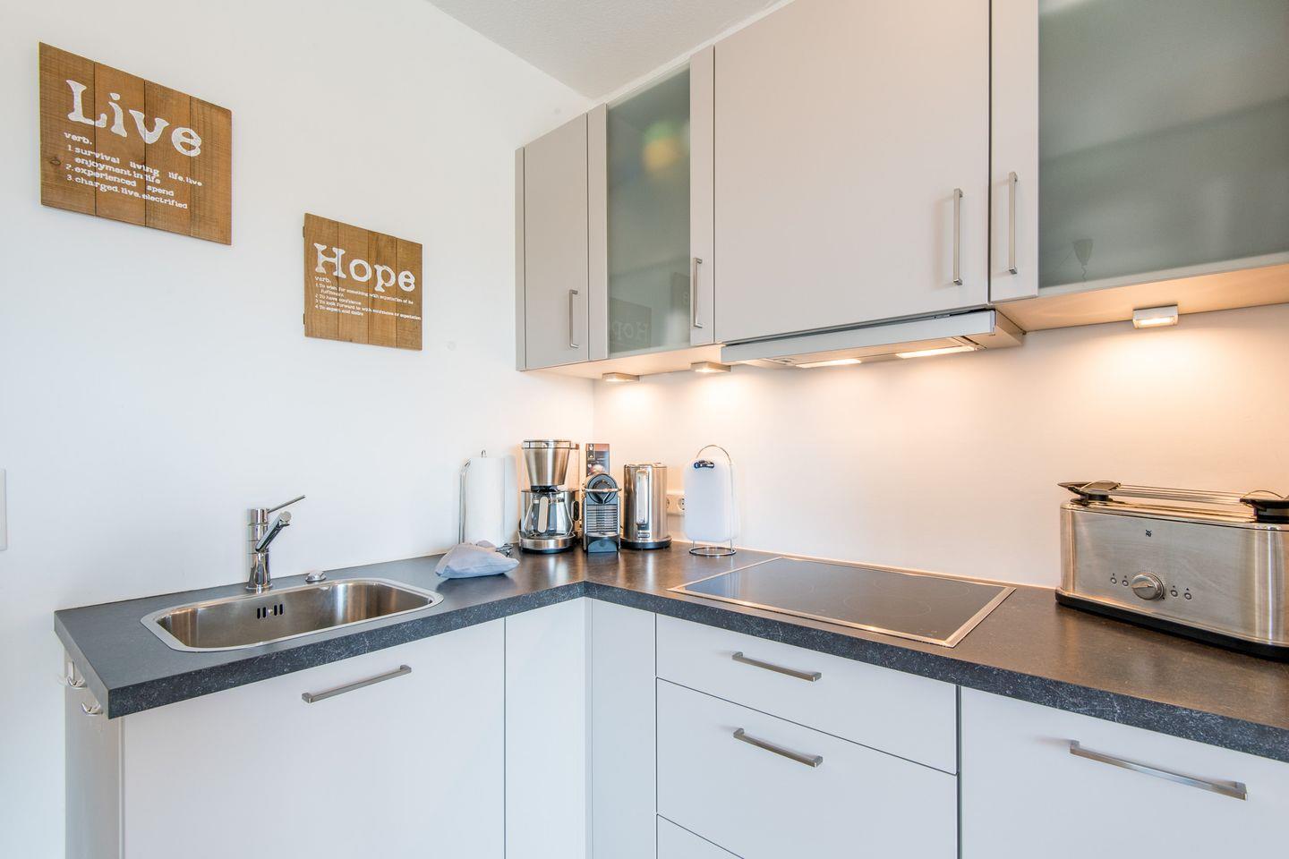 Die Küche ist ausgestattet mit einem 4-flammigen Ceran-Herd, Geschirrspüler, Filterkaffeemaschine und allem Komfort, den Sie für Ihren Aufenthalt benötigen.
